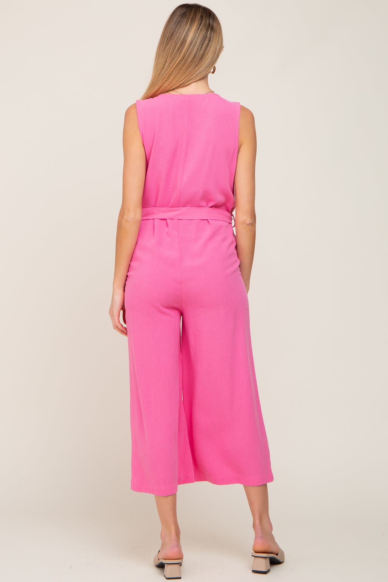 Pink Sleeveless Button Front Maternity Cropped Jumpsuit