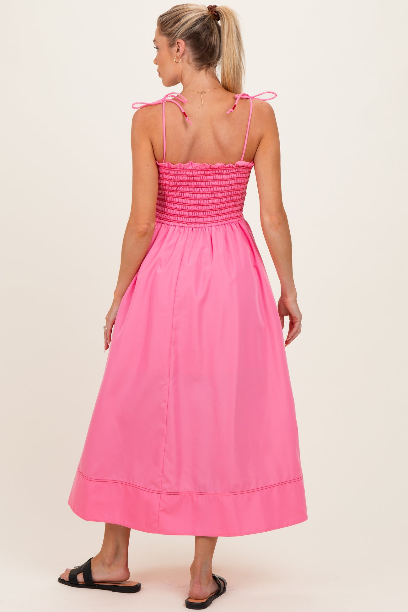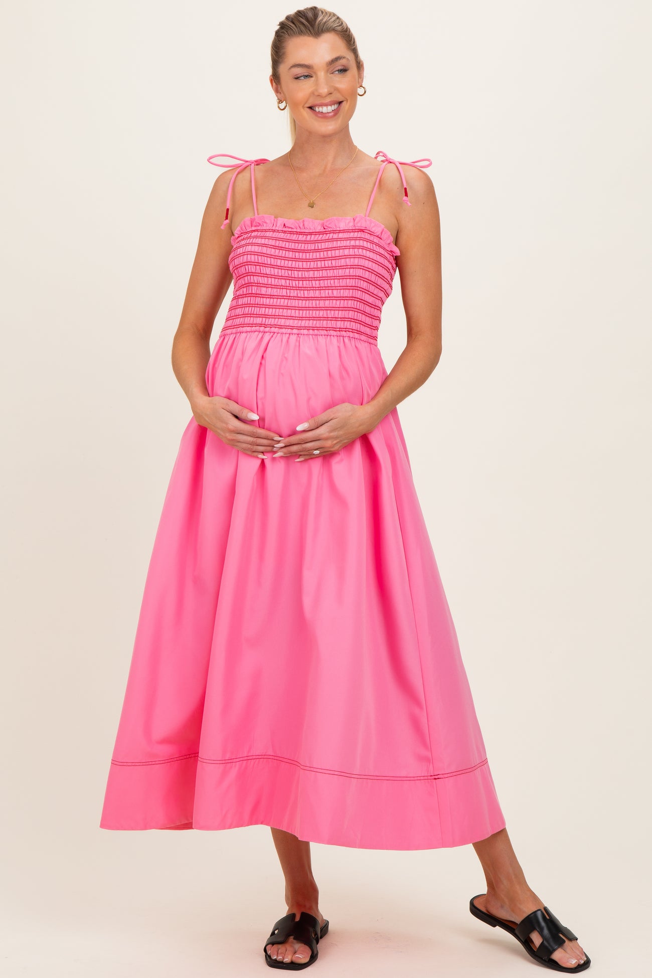 Pink Smocked Shoulder Tie Maternity Midi Dress