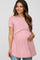 A solid hued peplum style maternity top featuring a crochet trim, short sleeves and a rounded neckline.