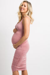 Pink Solid Ruched Fitted Maternity Bodycon Midi Dress