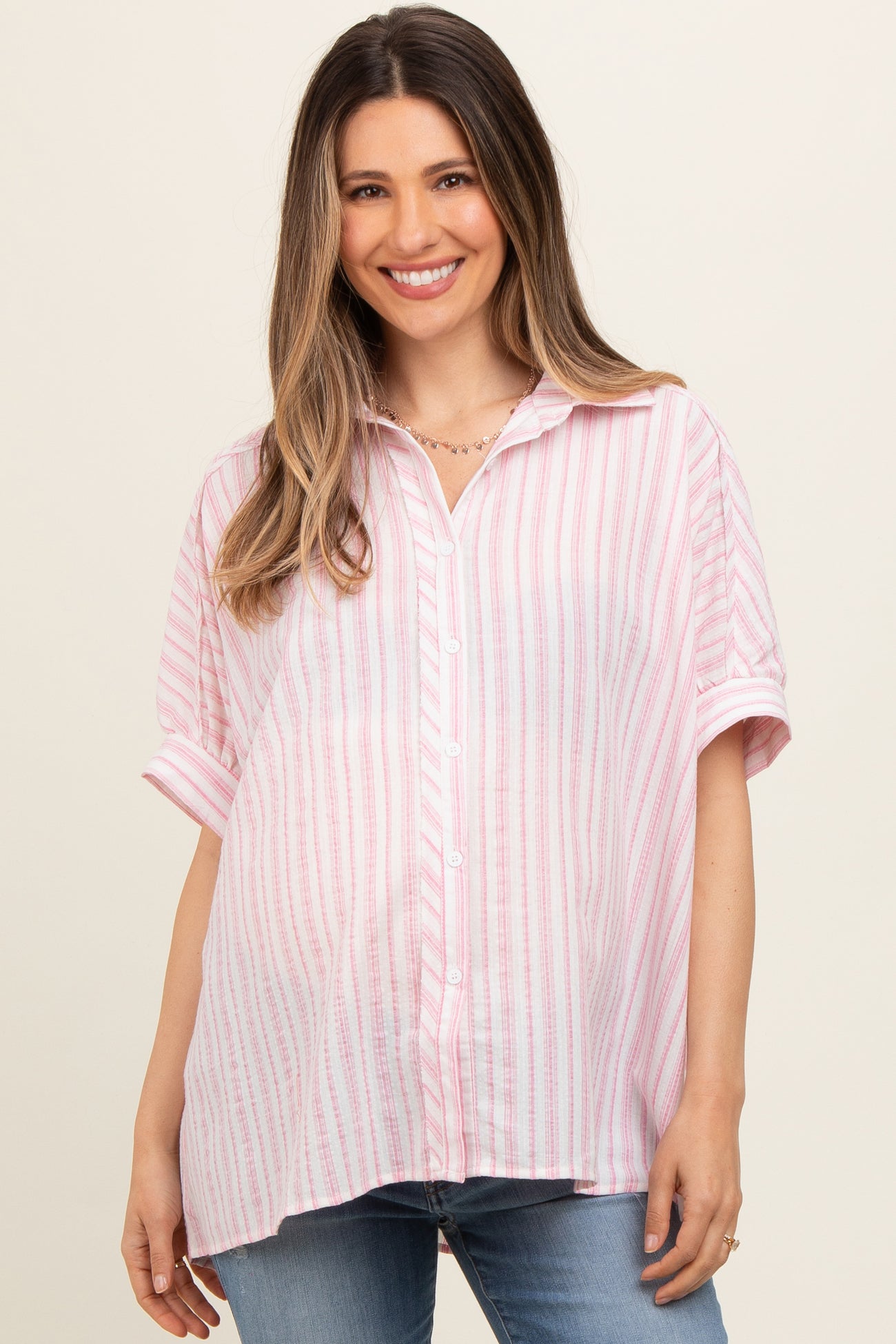 Pink Striped Button Up Collared Short Sleeve Maternity Top
