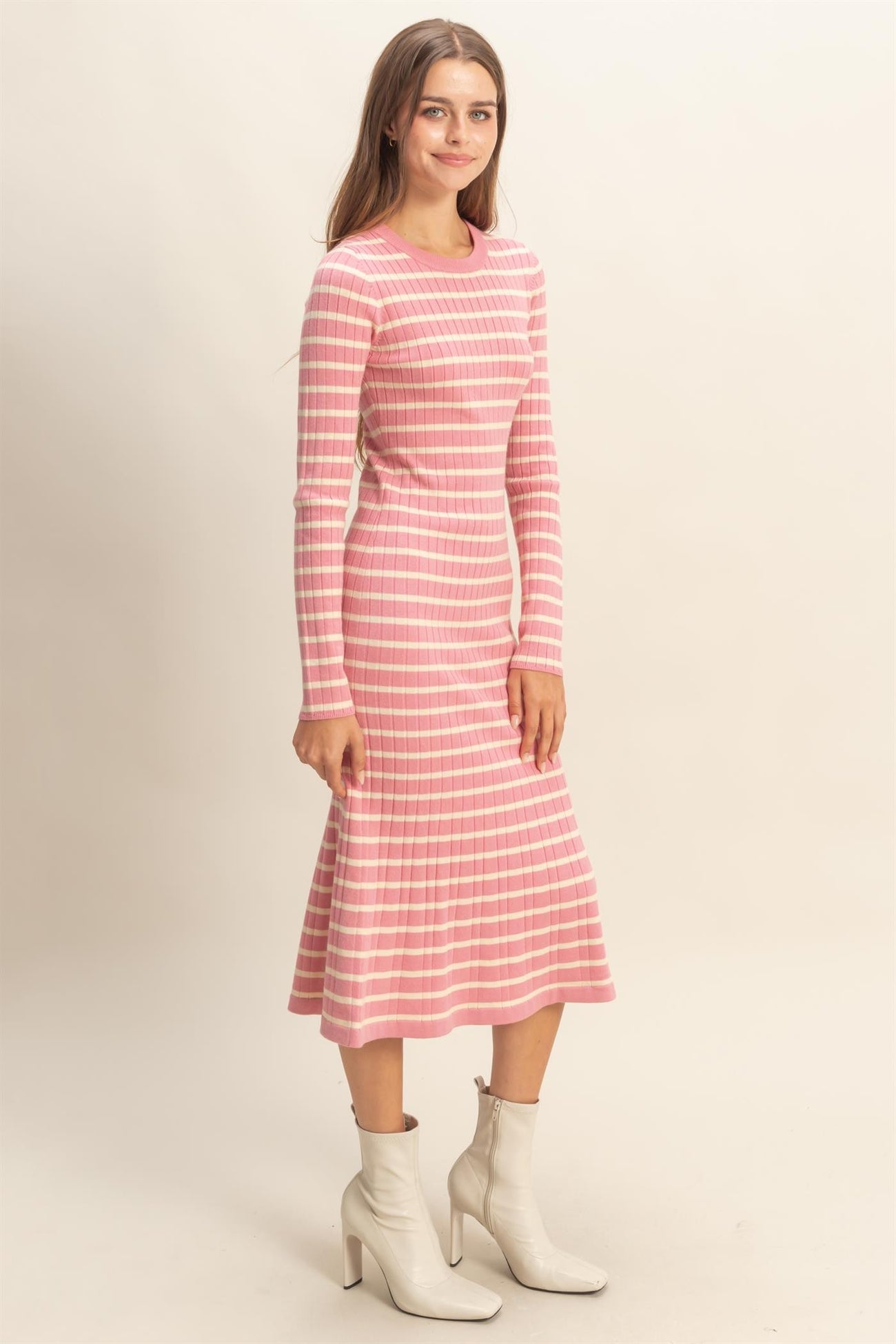 Step into effortless style with our Pink Striped Knit Midi Flare Dress. Crafted from soft, ribbed knit fabric, this dress features a flattering fitted silhouette that gently flares out at the hem for graceful movement. The elegant pink and cream stripes add a playful yet sophisticated touch, perfect for day-to-night wear. With long sleeves and a classic round neckline, it's an ideal choice for cooler seasons or layering. Pair it with ankle boots or heels for a chic, polished look. Comfortable, stylish, and versatile—this dress is a must-have addition to your wardrobe.