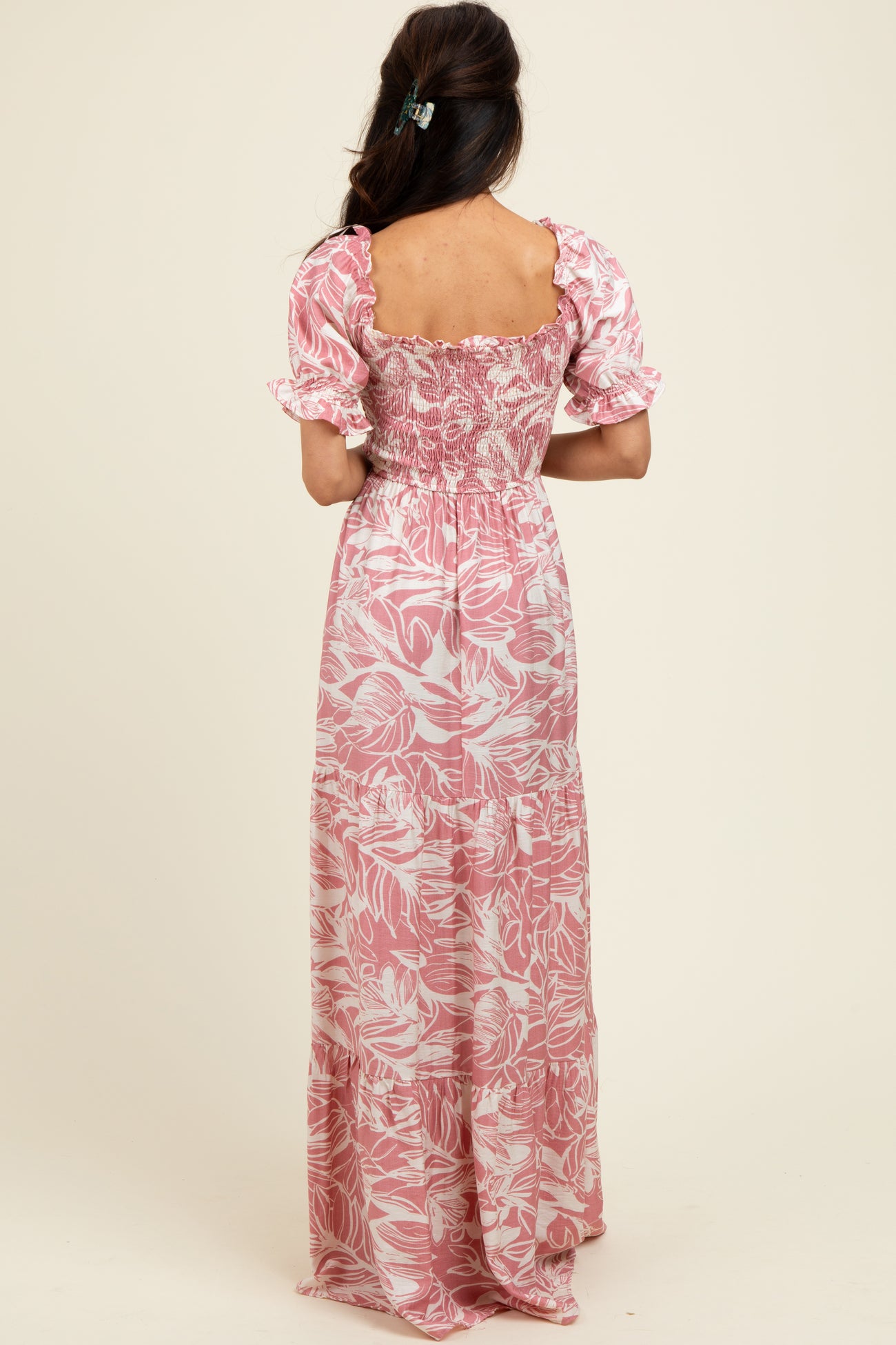 Pink Tropical Print Smocked Front Tie Maxi Dress