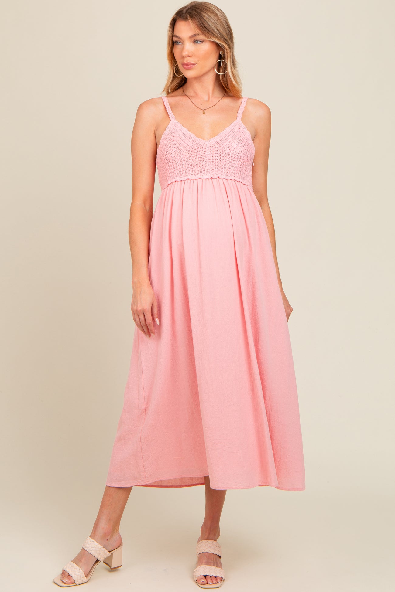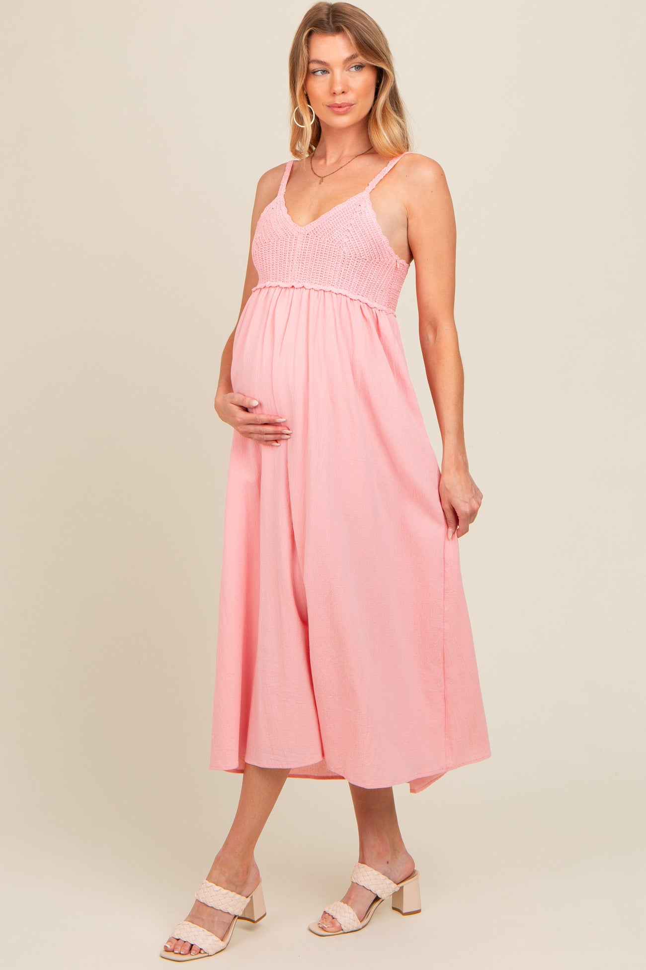 Pink V-Neck Crochet Top Maternity Midi Dress