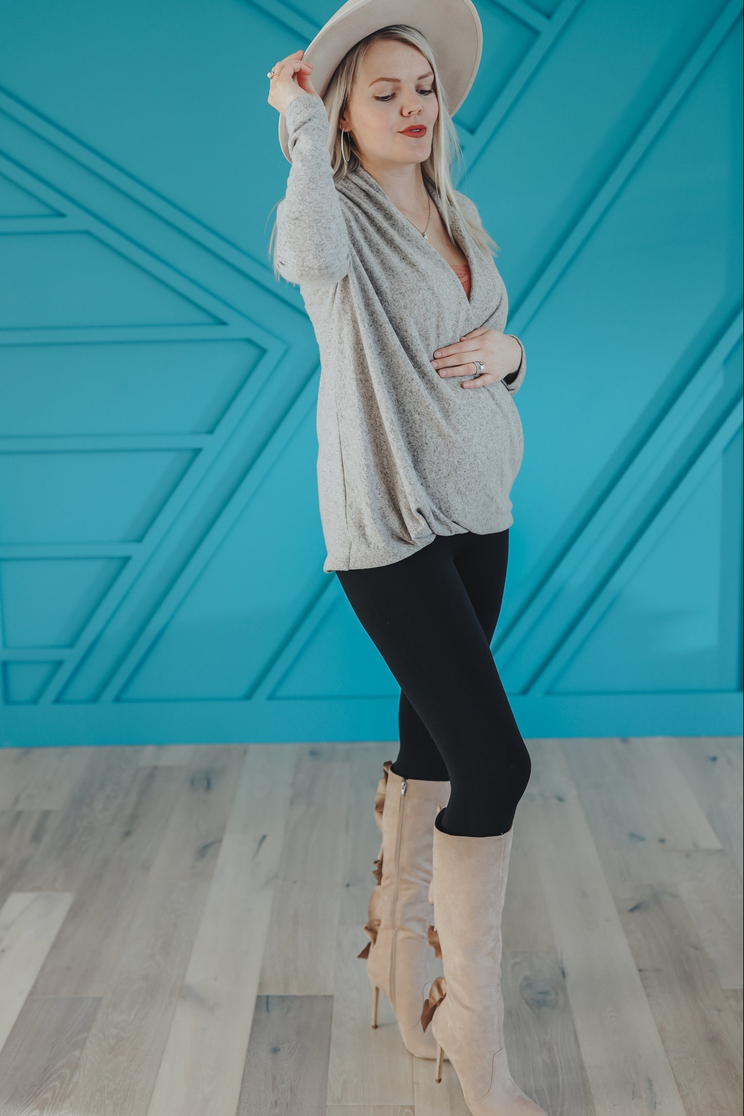PinkBlush Beige Knit Draped Wrap V-Neck Maternity Nursing Top