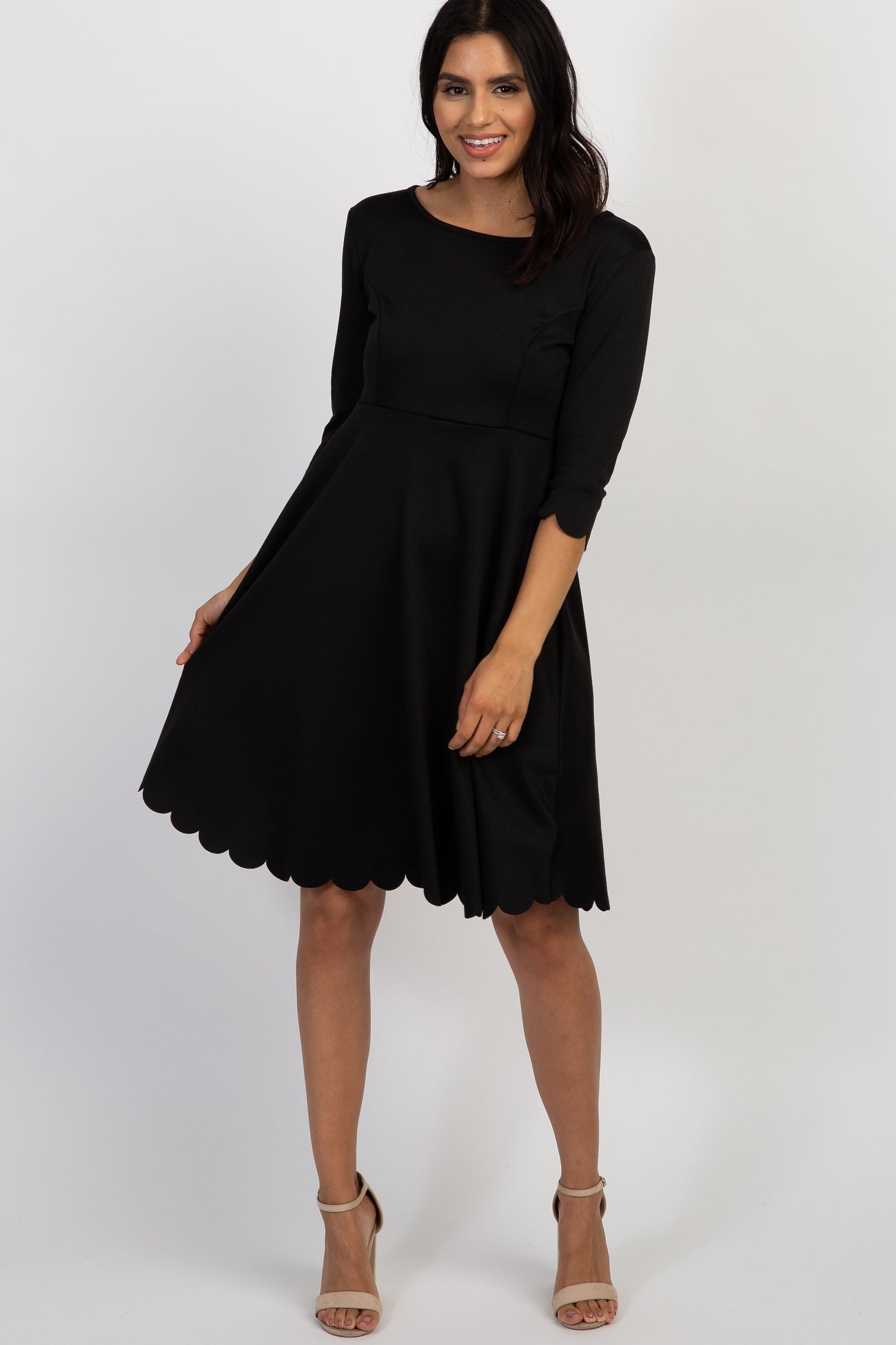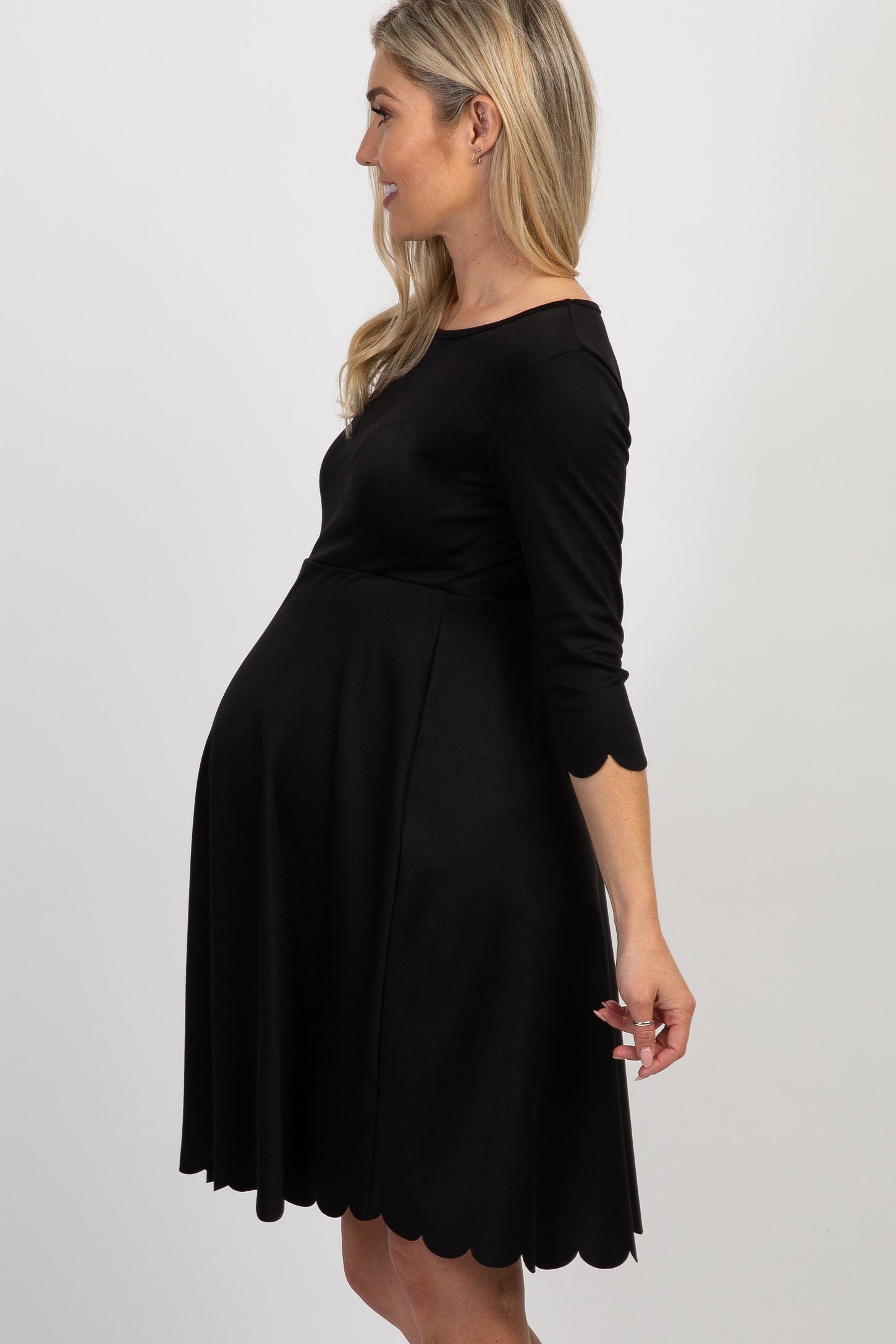 A solid maternity dress featuring a scalloped hemline and 3/4 sleeves, cinched waistline, a princess seams on bust, and a rounded neckline.