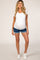 A solid hue denim maternity short featuring four pockets, a raw hem cuffed hem and an elastic belly band.