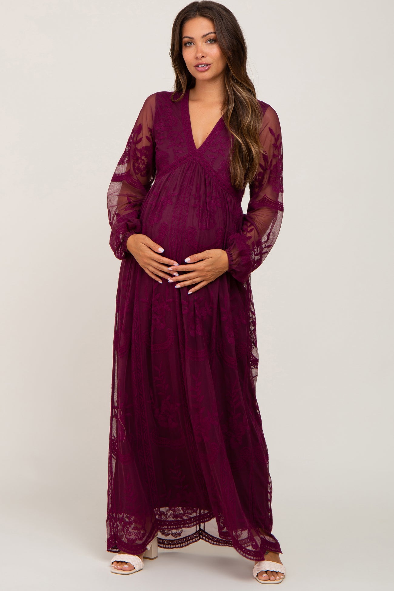 PinkBlush Burgundy Lace Mesh Long Sleeve Maternity Maxi Dress