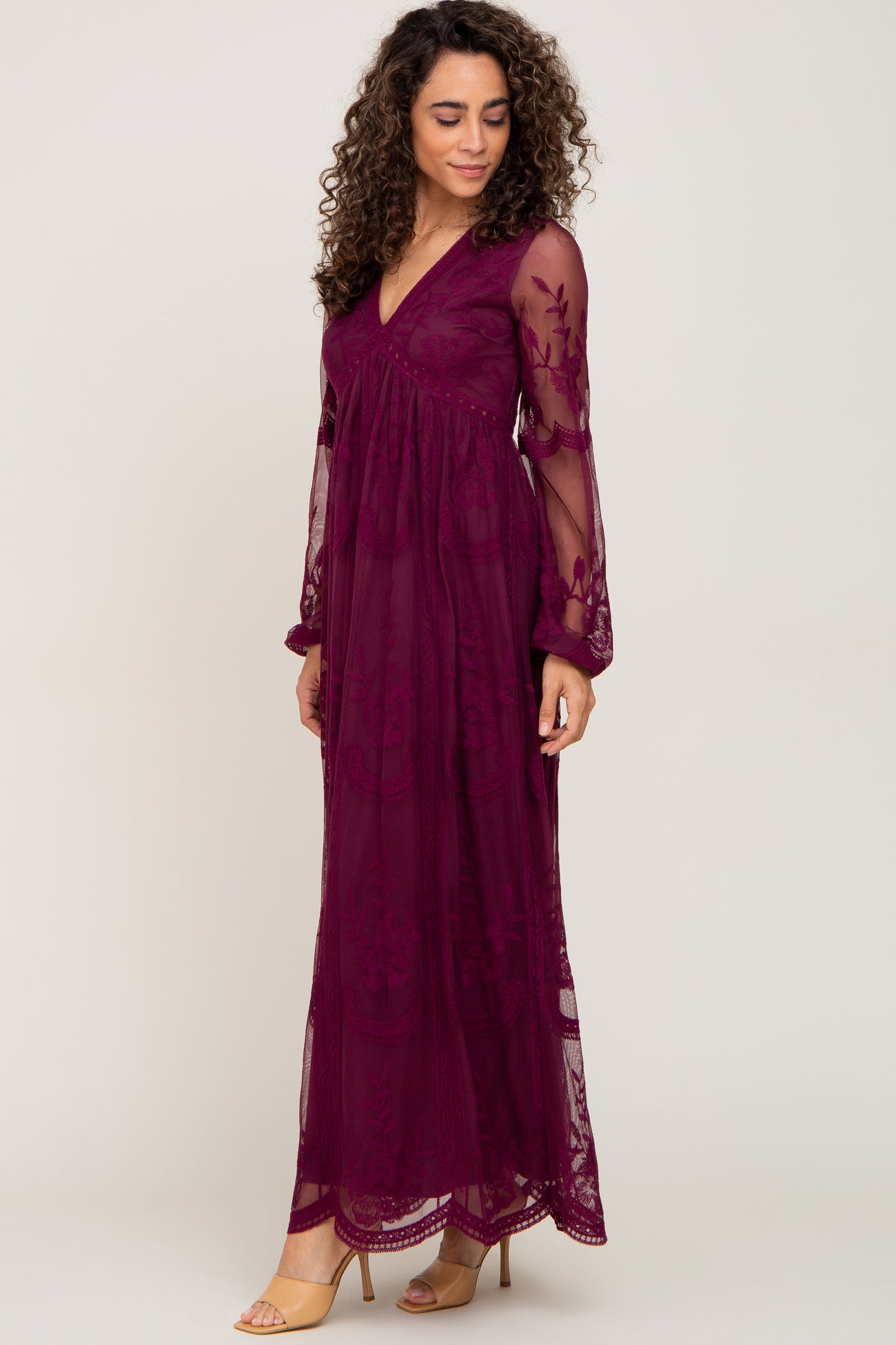 PinkBlush Burgundy Lace Mesh Overlay Long Sleeve Maxi Dress