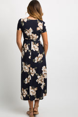 A floral, short sleeve midi dress featuring a wrap v-neckline, elastic cinching under the bust, a hi-low hemline, and a sash tie. Dress is double lined to prevent sheerness.