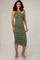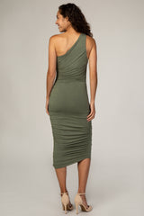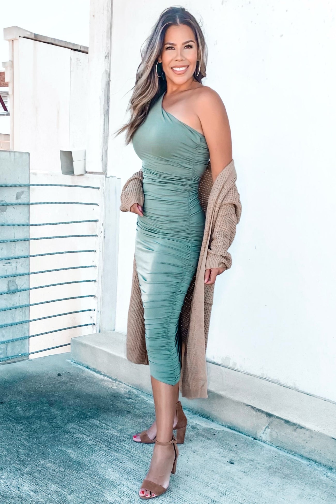 A fitted dress with ruching throughout and a one shoulder neckline.