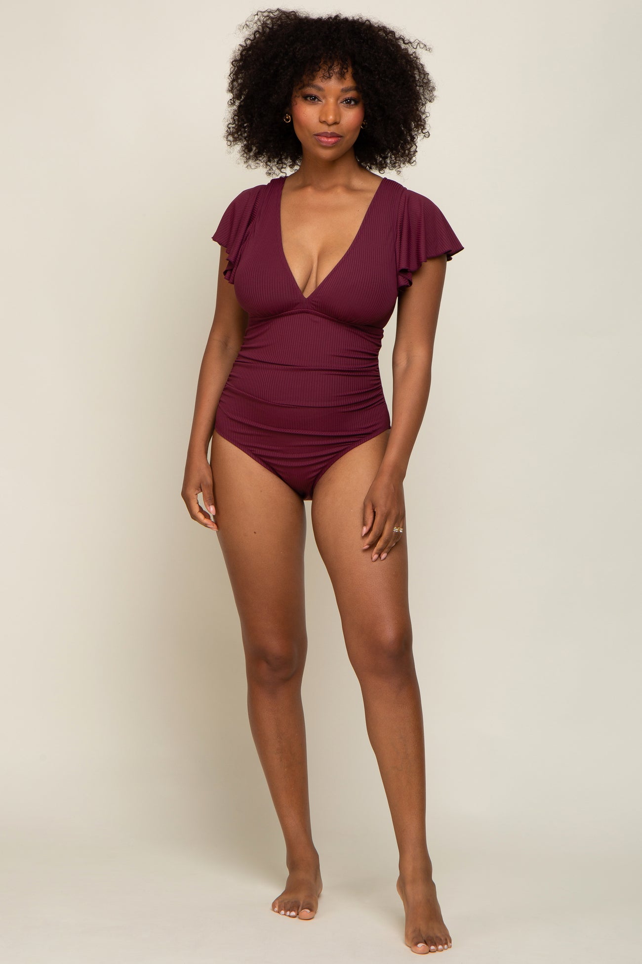 A ribbed one piece swimsuit. Features a deep v-neckline, short flounce sleeves, ruched sides, and removable padding at the bust.