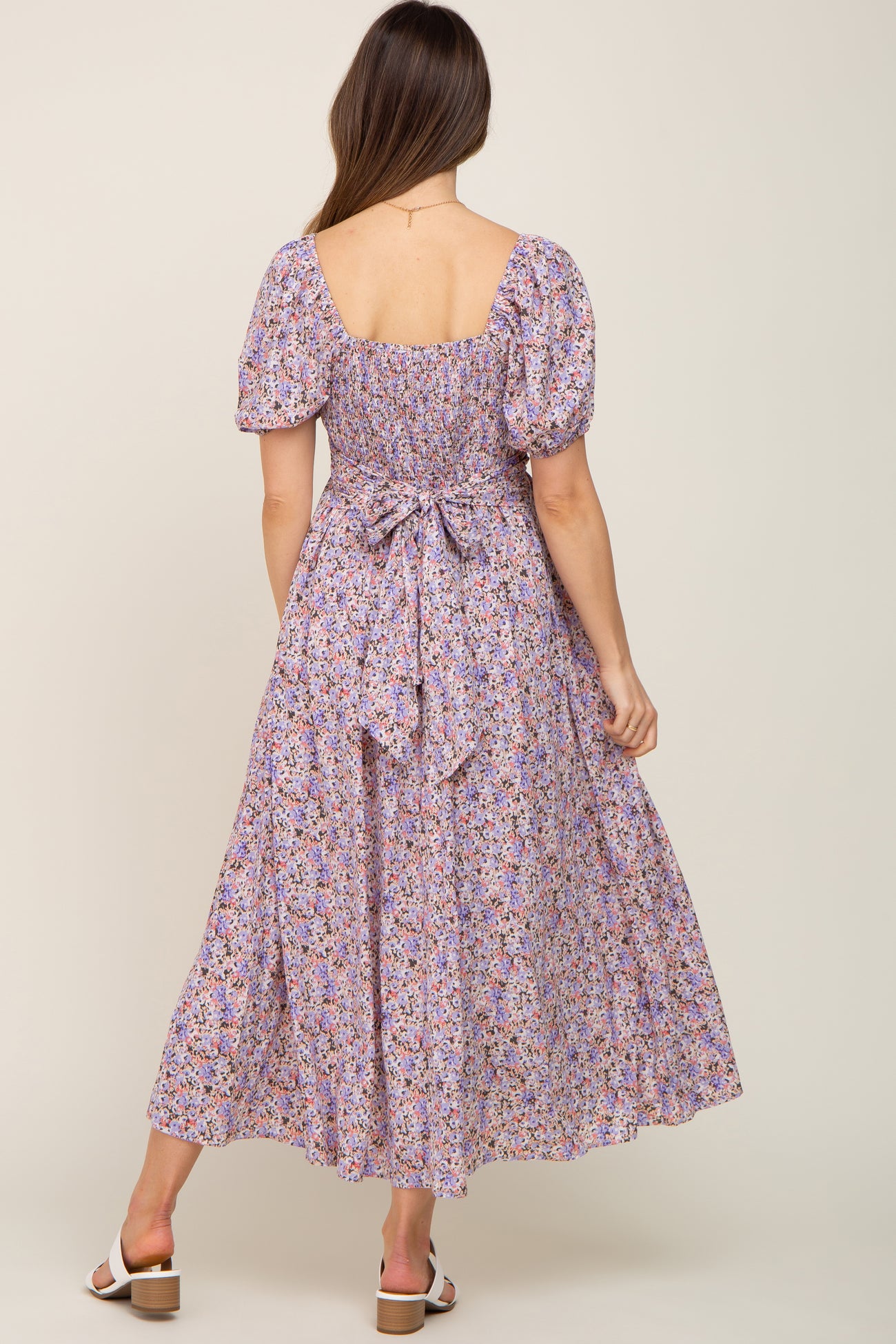 Purple Abstract Floral Smocked Maternity Midi Dress