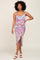 A printed midi dress featuring a cowl neckline, adjustable ties at the shoulders, a front adjustable drawstring with a slit.