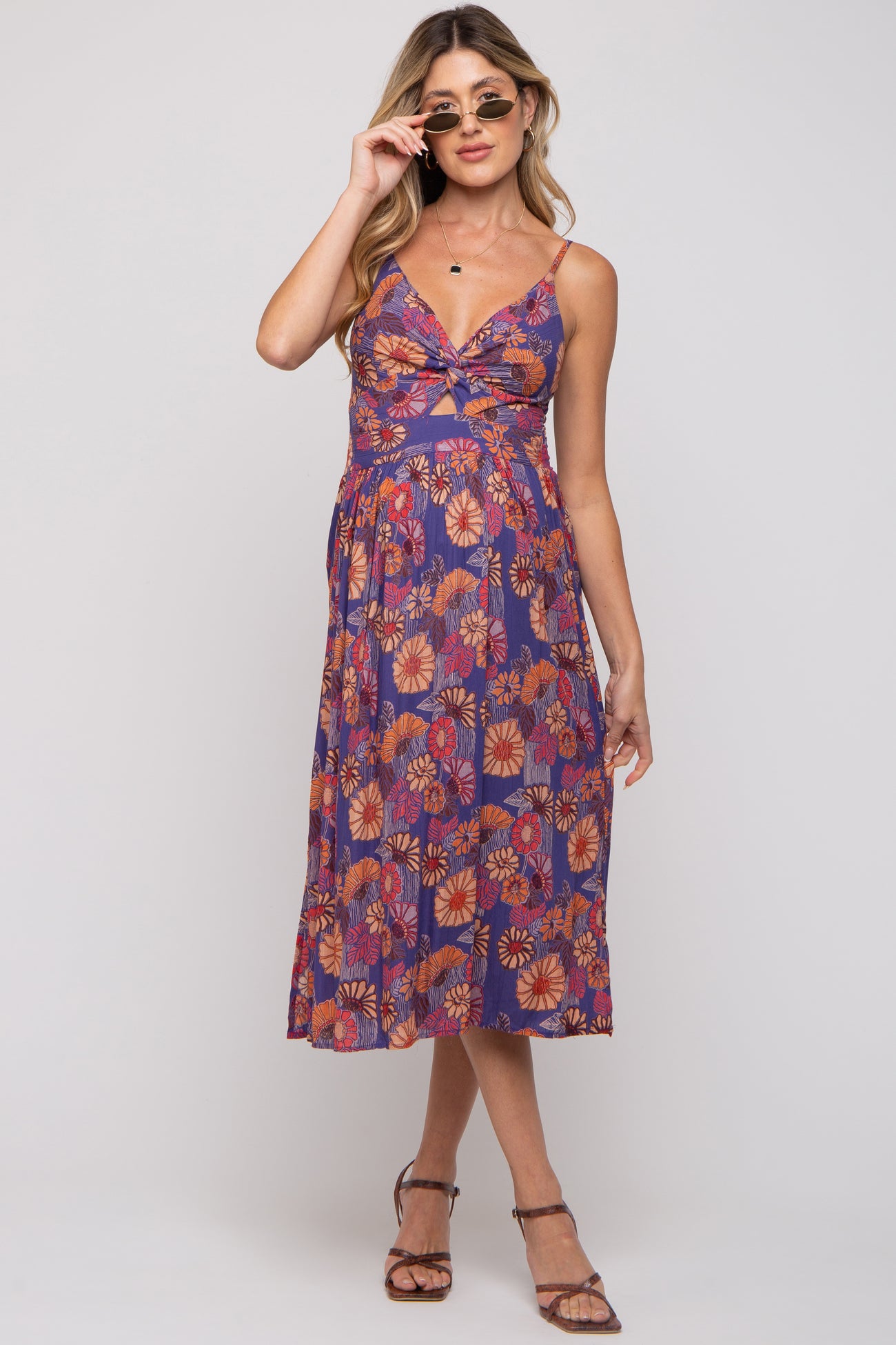 Purple Floral Sleeveless Cutout Maternity Midi Dress