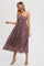 A paisley midi dress with a halter necktie, a smocked top, and a ruffle accent under the bust. Dress is fully lined.