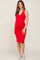 A solid, basic maternity dress with a v-neckline and a knee-length.