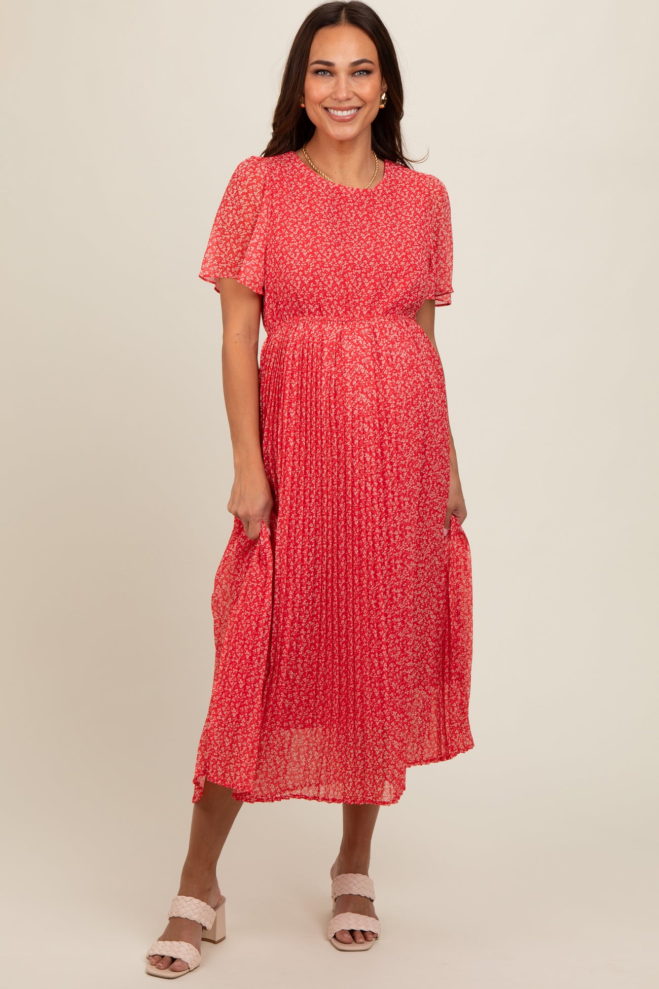 Red Ditsy Floral Pleated Maternity Midi Dress