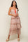 A floral sleeveless maxi dress featuring adjustable cami straps, a smocked top, a self-tie sweetheart neckline and a tiered skirt.