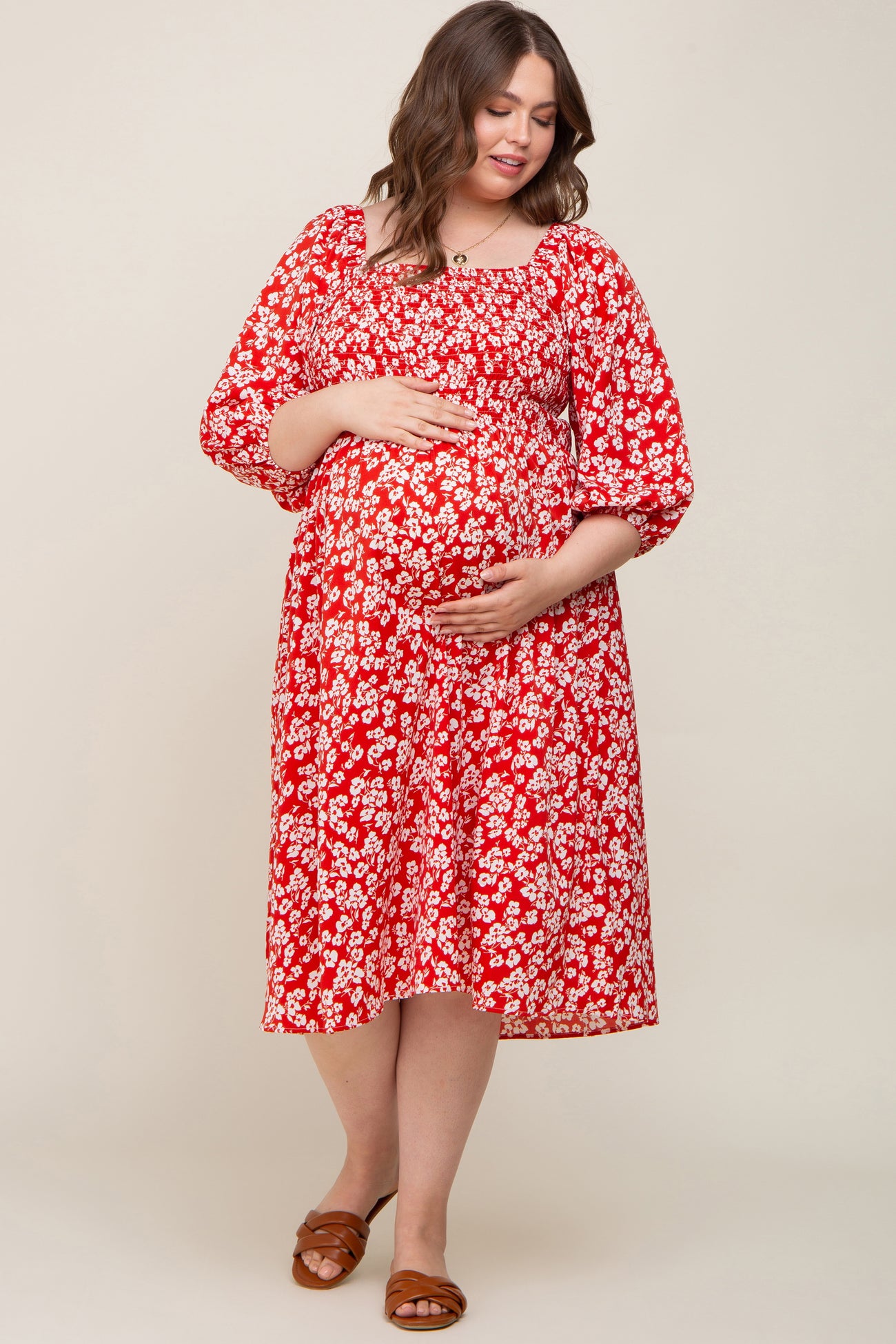 Details A floral print maternity plus size midi dress featuring a square neckline, a smocked elastic top and short bubble sleeves. Content + Care