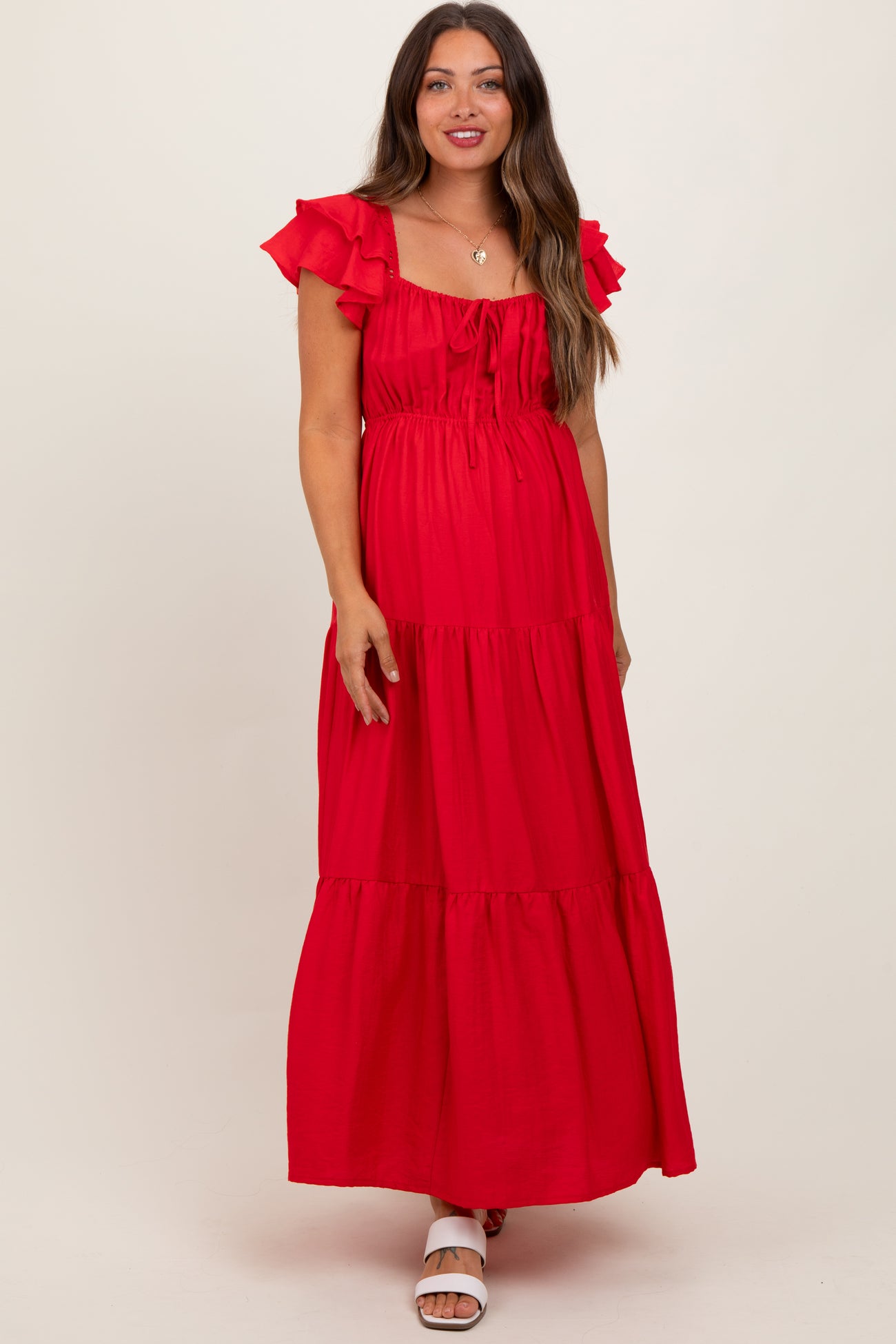 Red Layered Flutter Sleeve Tiered Maternity Maxi Dress