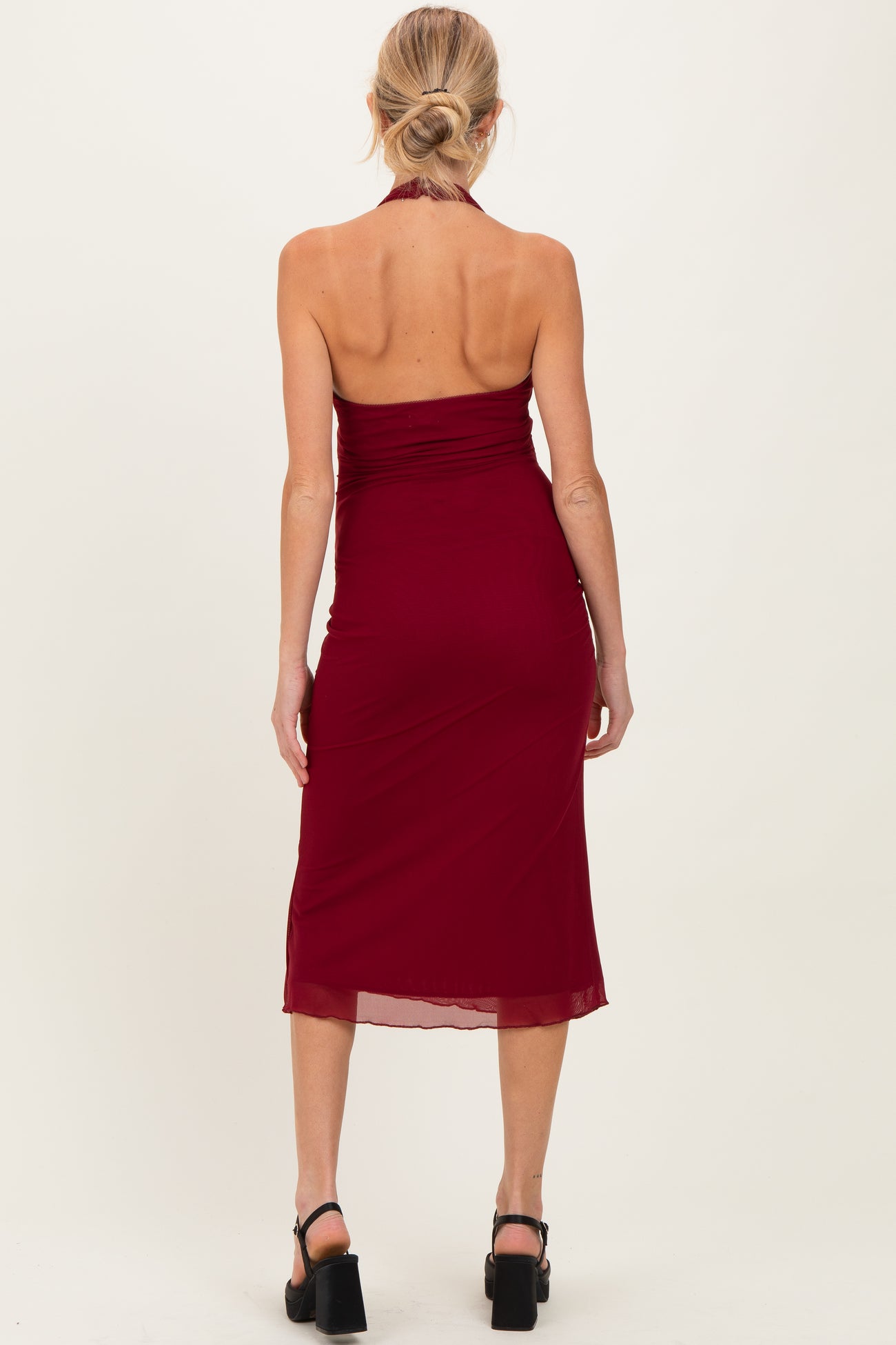Elevate your maternity style with this stunning Mesh Pendant Halter Midi Dress. Designed to embrace your growing bump, this dress features a flattering halter neckline with a delicate pendant accent that adds a touch of elegance. The breathable mesh fabric offers a lightweight feel and subtle texture, ensuring comfort throughout the day or night. Its midi length creates a sophisticated silhouette, perfect for special occasions or evening events. The ruched sides provide gentle stretch and extra room for your baby bump, allowing you to move with ease and confidence. Pair it with your favorite heels and accessories for a chic, maternity-ready look.