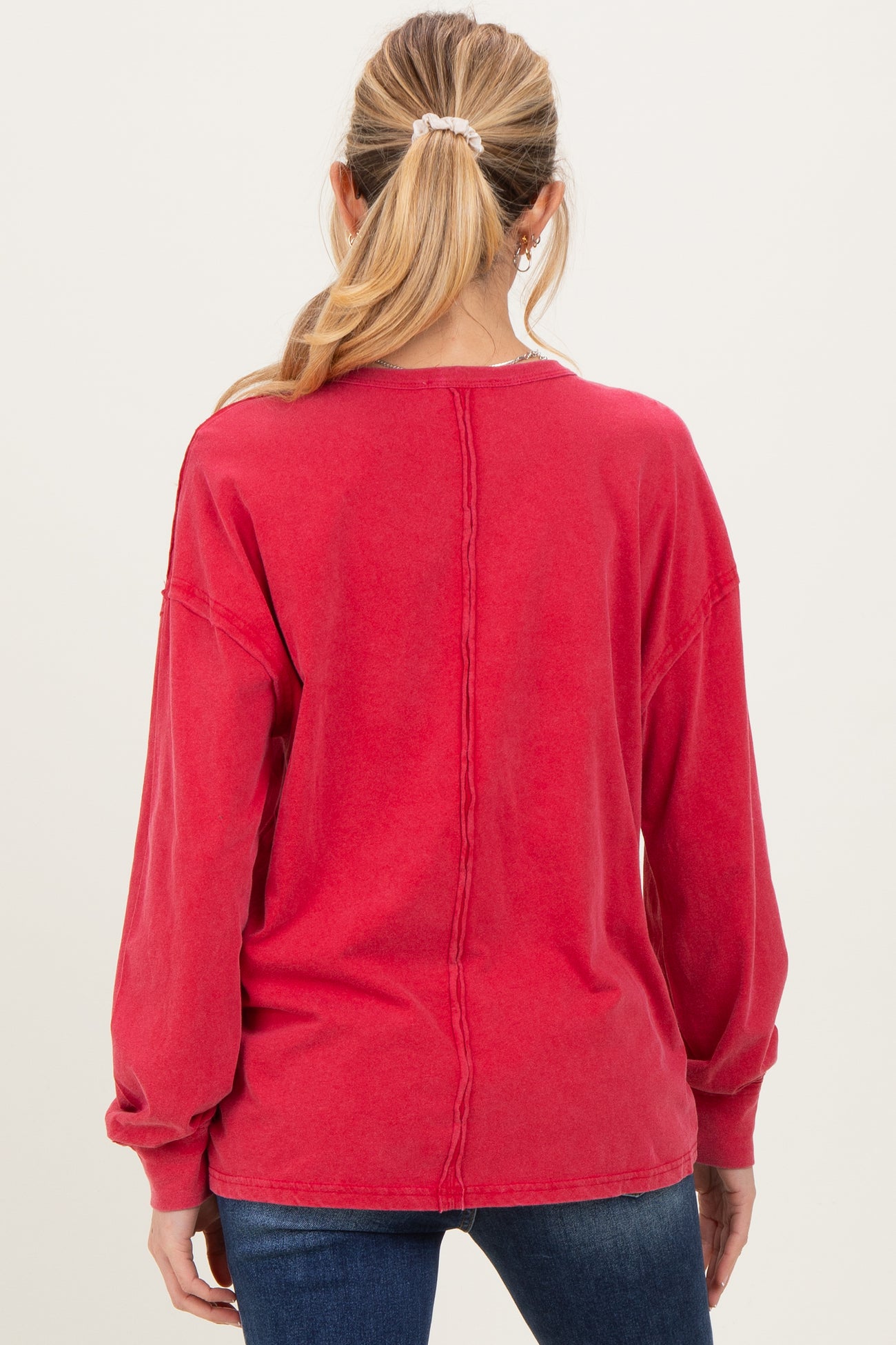 Red Oversized Washed Long Sleeve Pocket Maternity Top