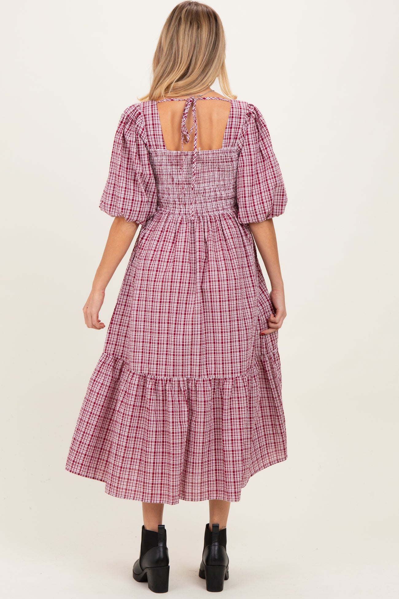 Elevate your maternity wardrobe with this charming bubble sleeve dress, designed for both style and comfort. Featuring a flattering smocked bodice that gently stretches to accommodate your growing bump, this dress offers a perfect fit throughout pregnancy. The square neckline adds a touch of modern elegance, while the voluminous bubble sleeves create a playful silhouette. Crafted from soft, breathable fabric, it ensures all-day comfort. The midi length with a tiered skirt flows gracefully, ideal for casual outings or special occasions. Convenient side pockets add functionality without compromising style. Pair with your favorite boots or flats for a chic maternity look.