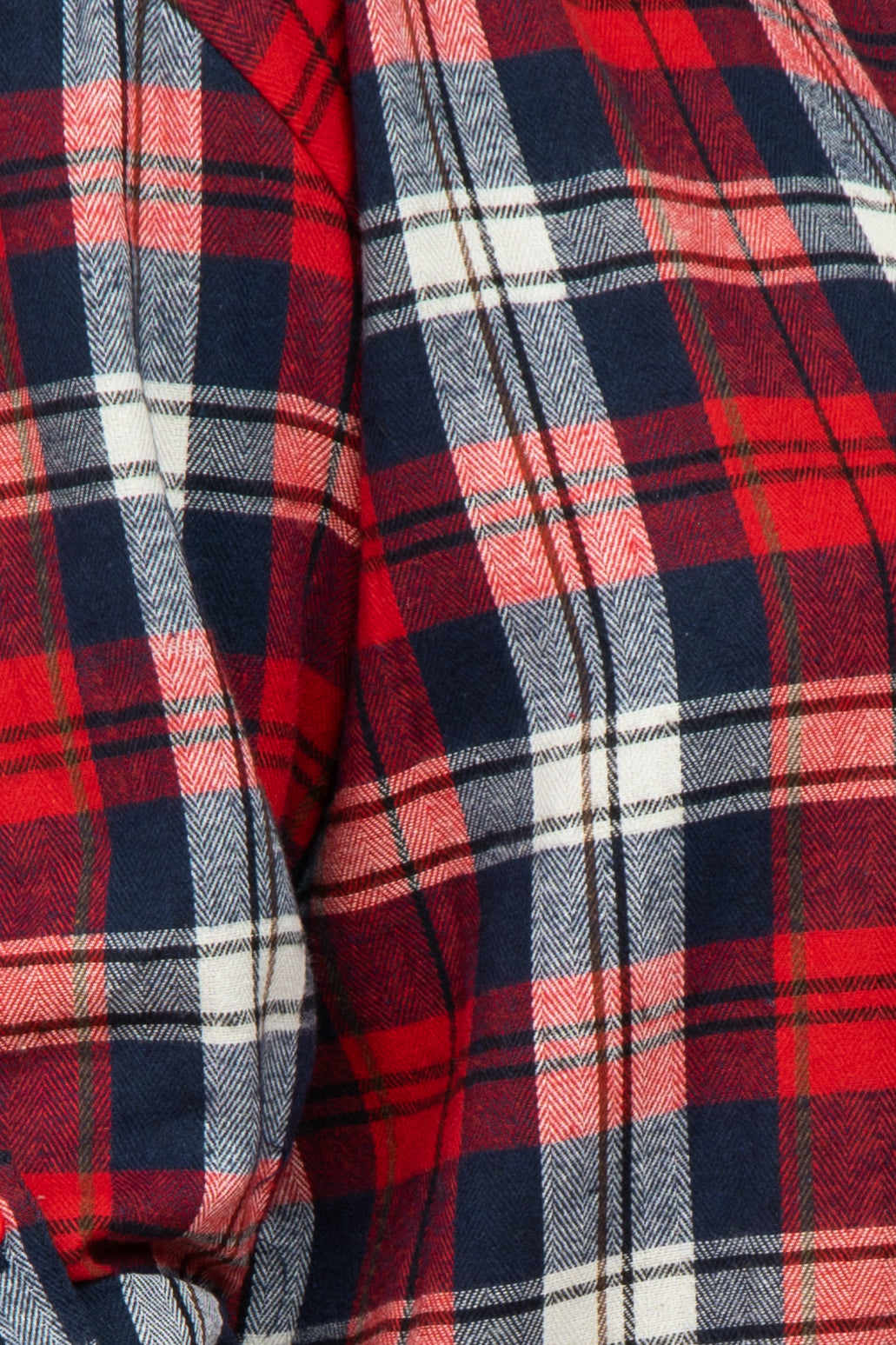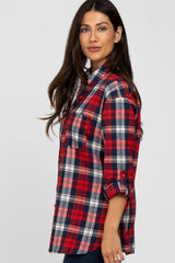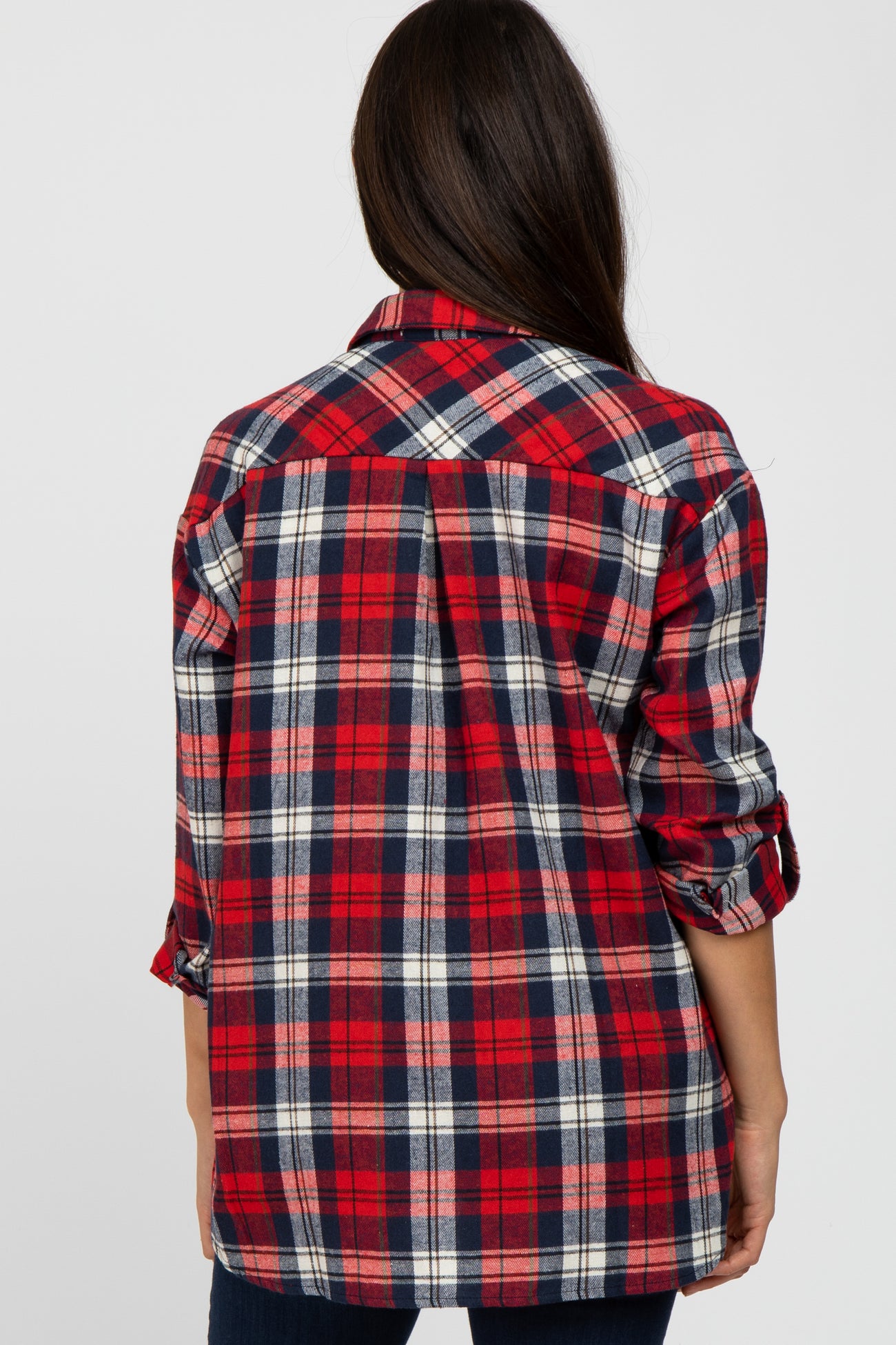 A plaid print top featuring an oversize fit, front buttons, long sleeves and a collared neckline.