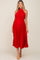 A solid maternity halter dress in a shimmery pleated material with a sash tie waist and keyhole button closure in back.