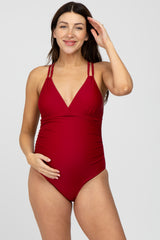 Red Ruched Side Strappy Cross Back Maternity One Piece Swimsuit