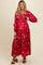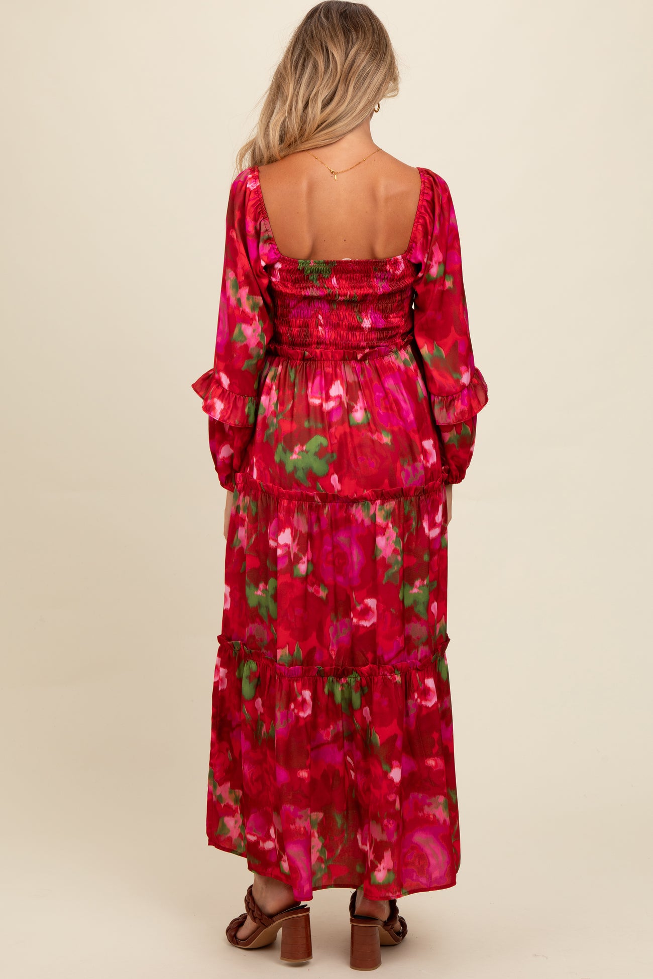 Red Satin Floral Smocked Ruffle Tier Maternity Maxi Dress