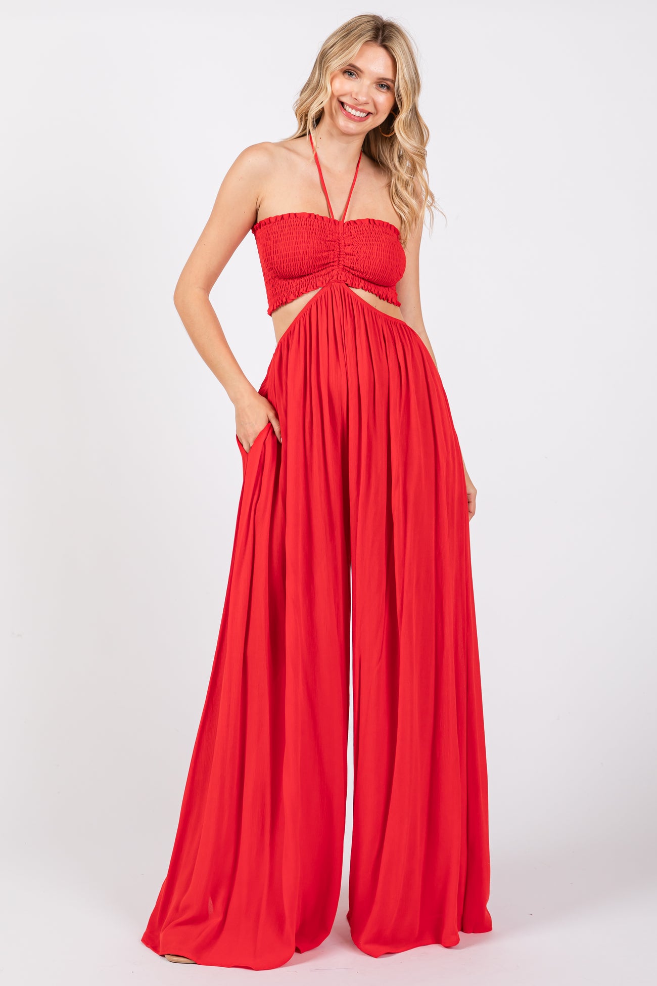 Red Smocked Drawstring Halter Side Cutout Maternity Jumpsuit