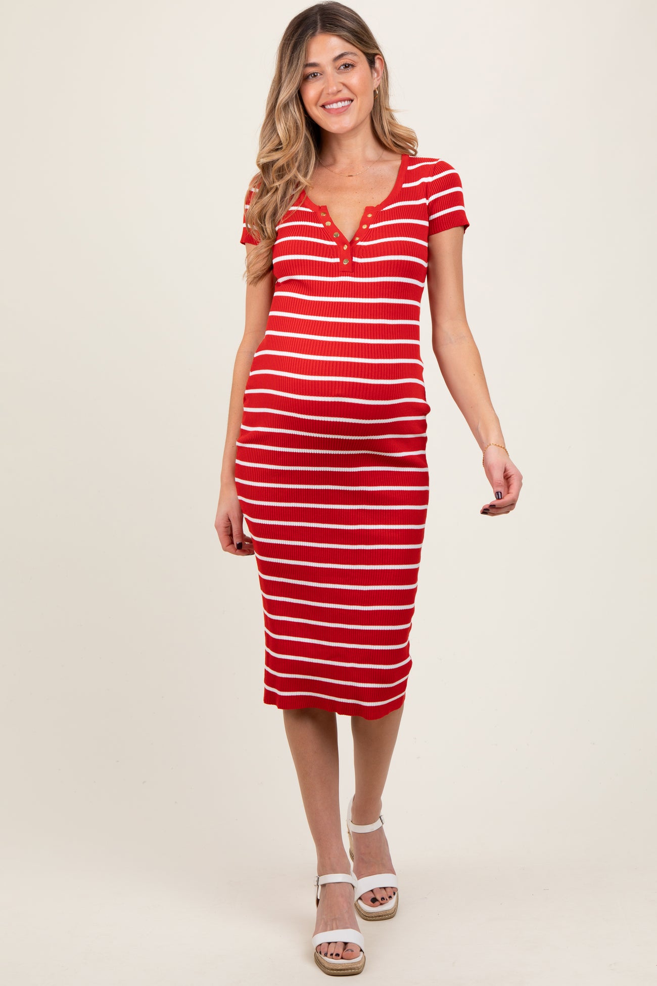 Red Striped Ribbed Henley Fitted Maternity Midi Dress