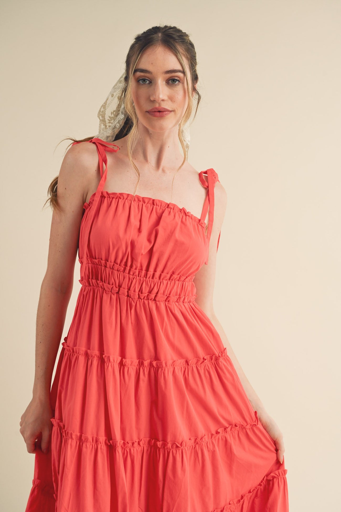 A solid midi dress with self tie straps, tiered body, and ruffle accents. Dress is lined. Pocketed.