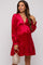 A velvet maternity dress with a deep v-neckline, long cinched sleeves, and a gathered bottom tier.