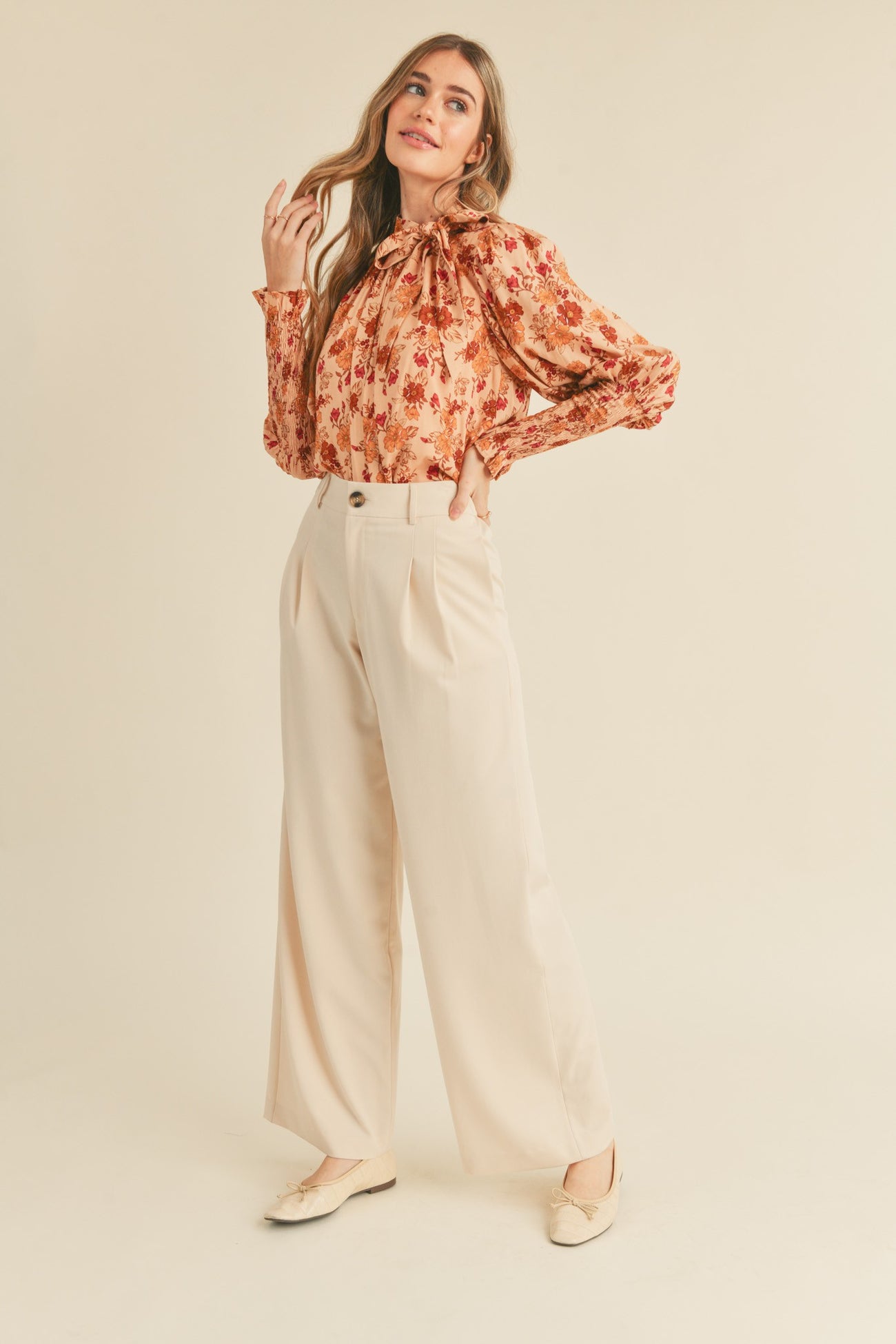 Rose Bud Multi Floral Tie Neck Smocked Sleeve Top