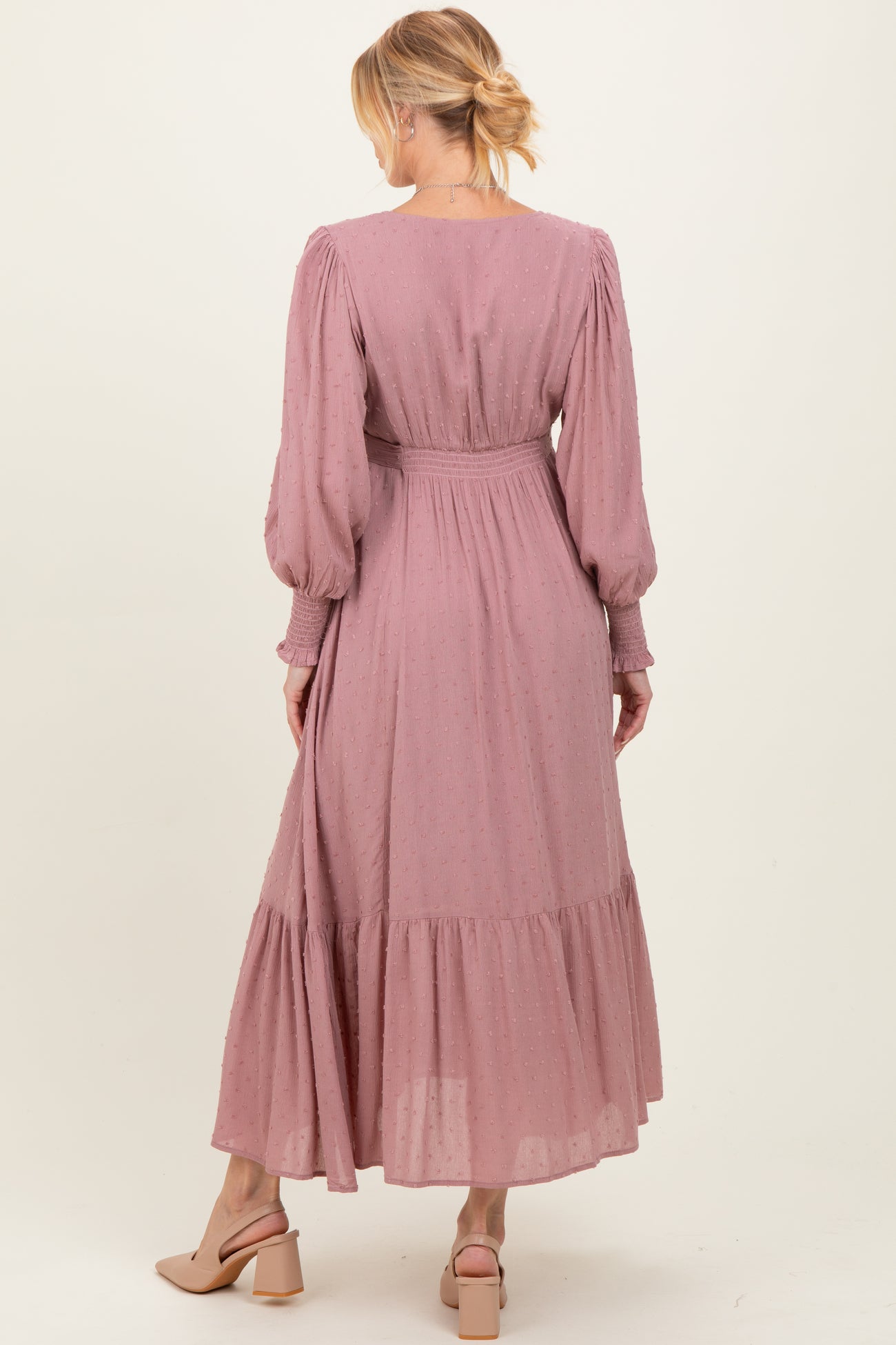 Elevate your maternity wardrobe with our Rose Swiss Dot Button Down Maternity Maxi Dress. Crafted from lightweight, breathable fabric with delicate Swiss dot texture, this dress offers both comfort and style throughout pregnancy. Featuring a flattering V-neckline, long puff sleeves with smocked cuffs, and a button-down front, it’s designed to grow with you. The adjustable waist tie accentuates your bump while providing a customizable fit. Perfect for casual outings or special occasions, this dusty rose maxi dress combines effortless elegance with practical comfort. Pair with heels or flats for a chic maternity look.