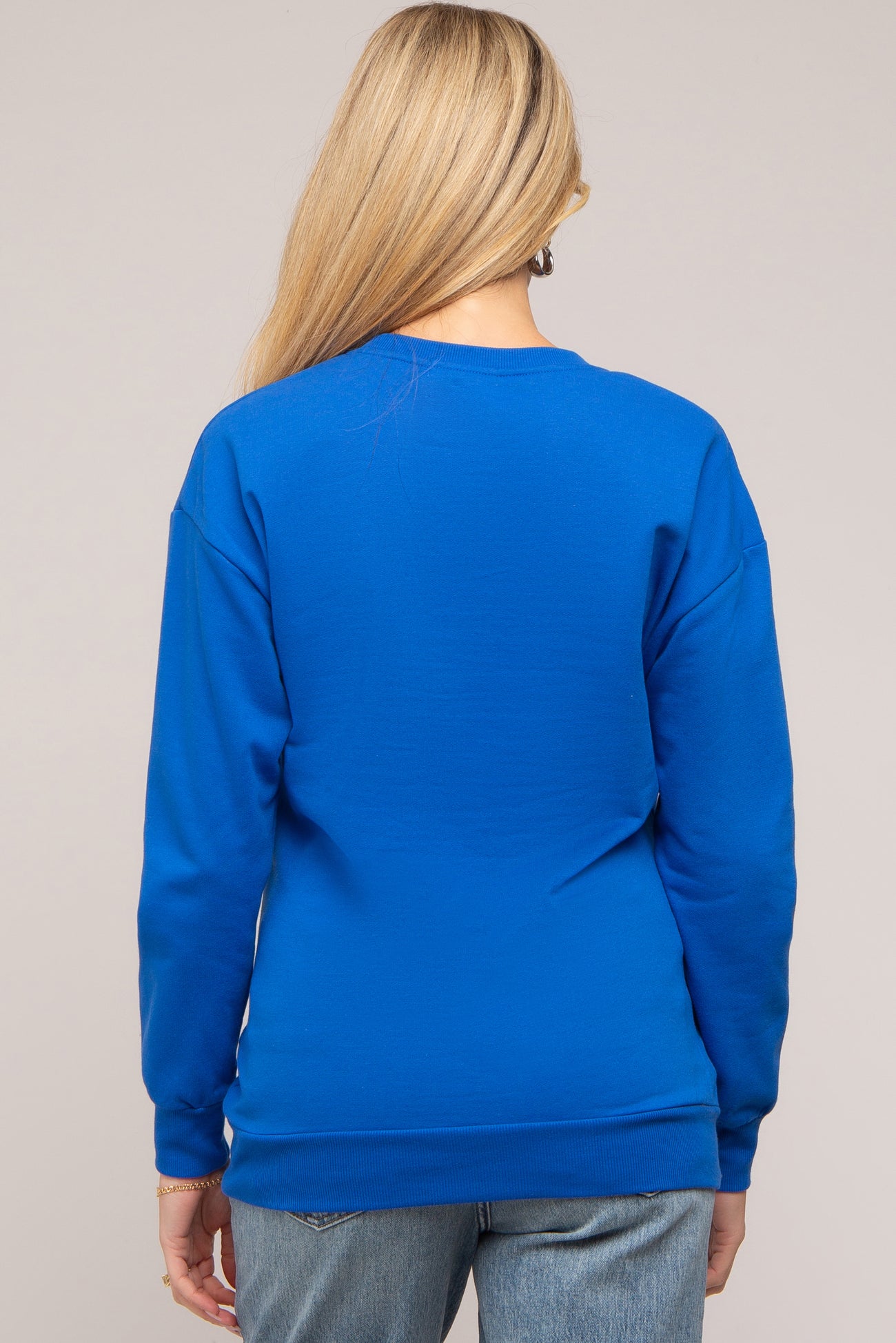A solid hued pullover maternity sweatshirt featuring long sleeves and a rounded neckline.