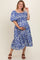 Royal Printed Smocked Puff Sleeve Plus Maternity Midi Dress