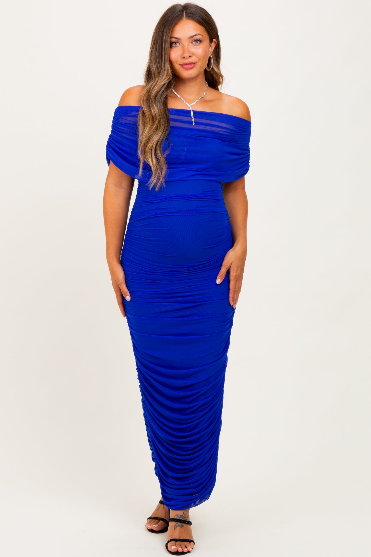 Royal Ruched Mesh Foldover Off Shoulder Maternity Maxi Dress