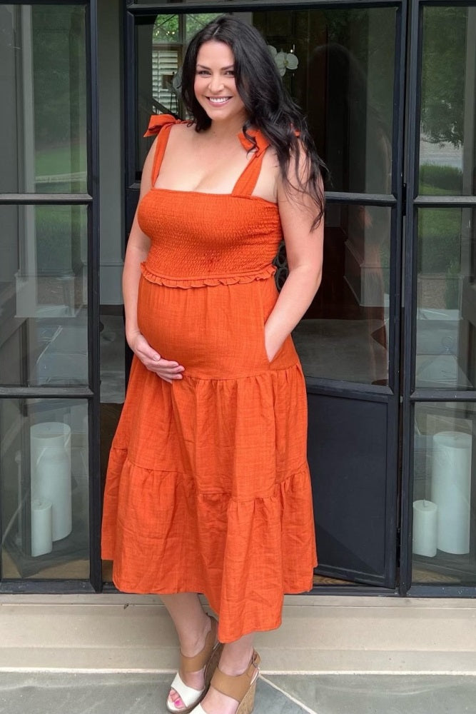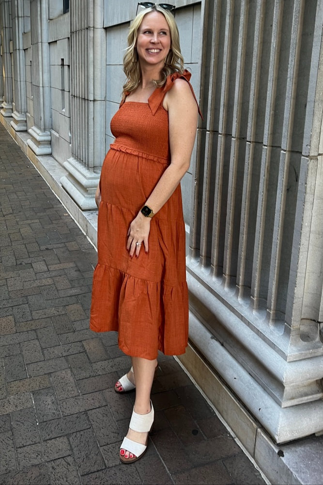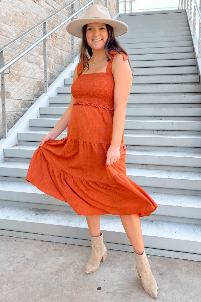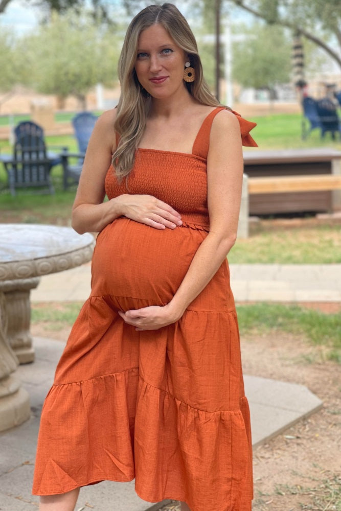 Embrace effortless style with our Bow Strap Tiered Maternity Midi Dress. Designed for growing bumps, this dress features adjustable bow-tie straps for a customizable fit and easy nursing access after baby arrives. The soft, lightweight fabric flows into a tiered silhouette, providing all-day comfort and a flattering drape. Ideal for baby showers, brunches, or casual outings, this dress transitions seamlessly from season to season. Dress it up with sandals and statement jewelry, or keep it casual with flats. Stay chic and comfortable at every stage of motherhood with this must-have midi dress!