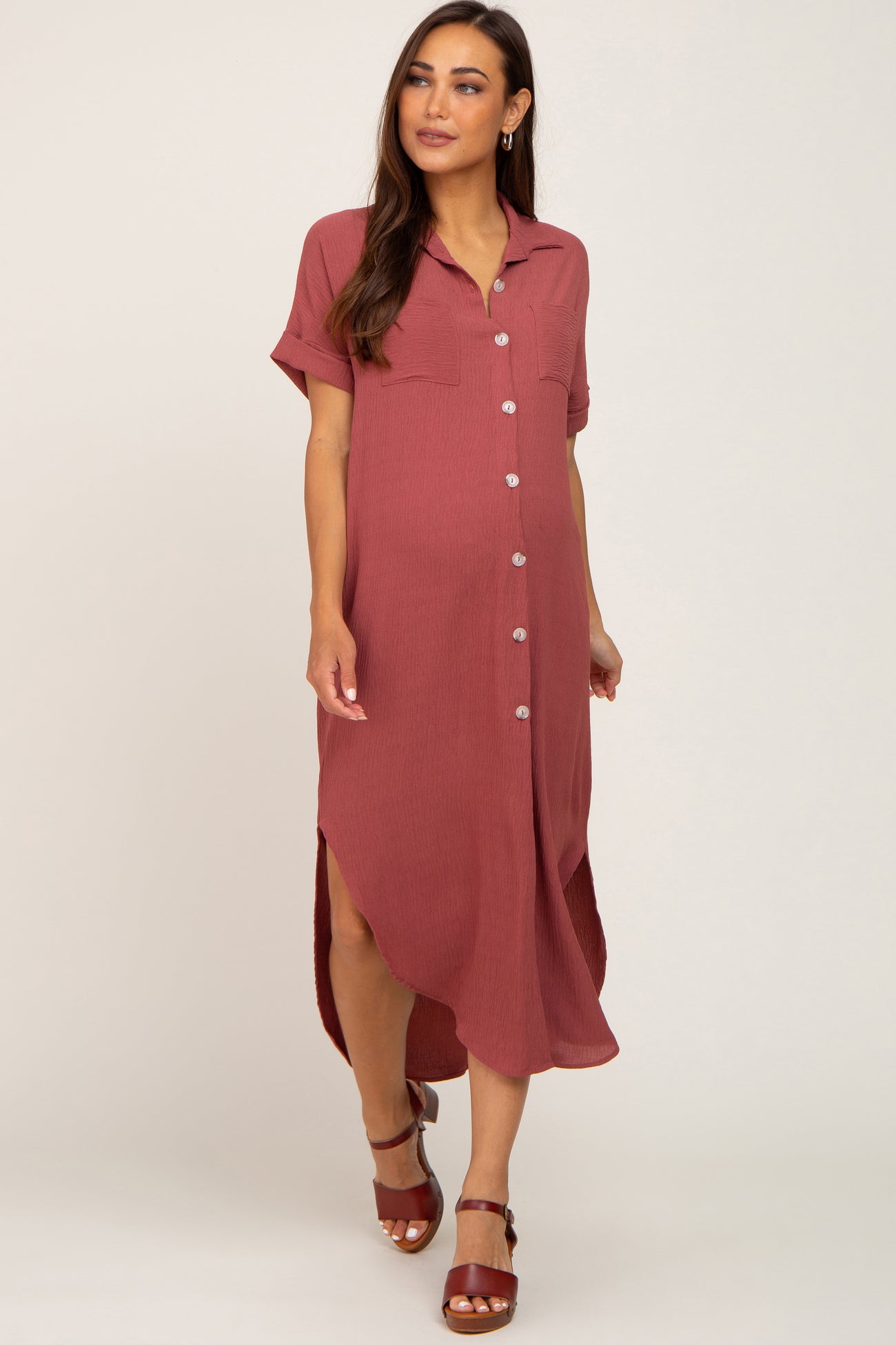 Rust Button Down Hi Low Maternity Maxi Dress