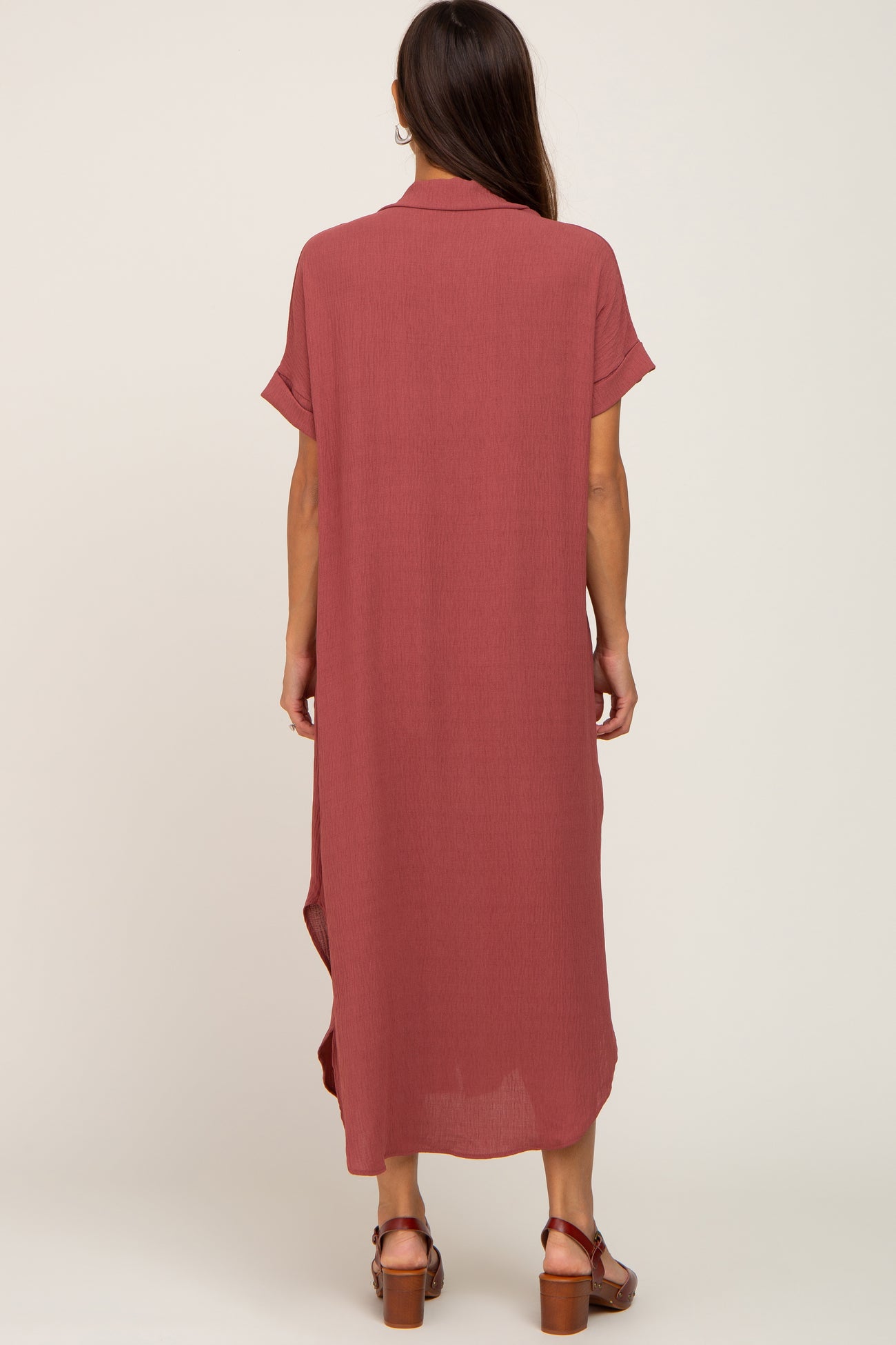 A solid maternity maxi dress featuring functioning front buttons, a collar, two front pockets, cuffed short dolman sleeves, and a hi-low rounded hemline.