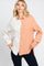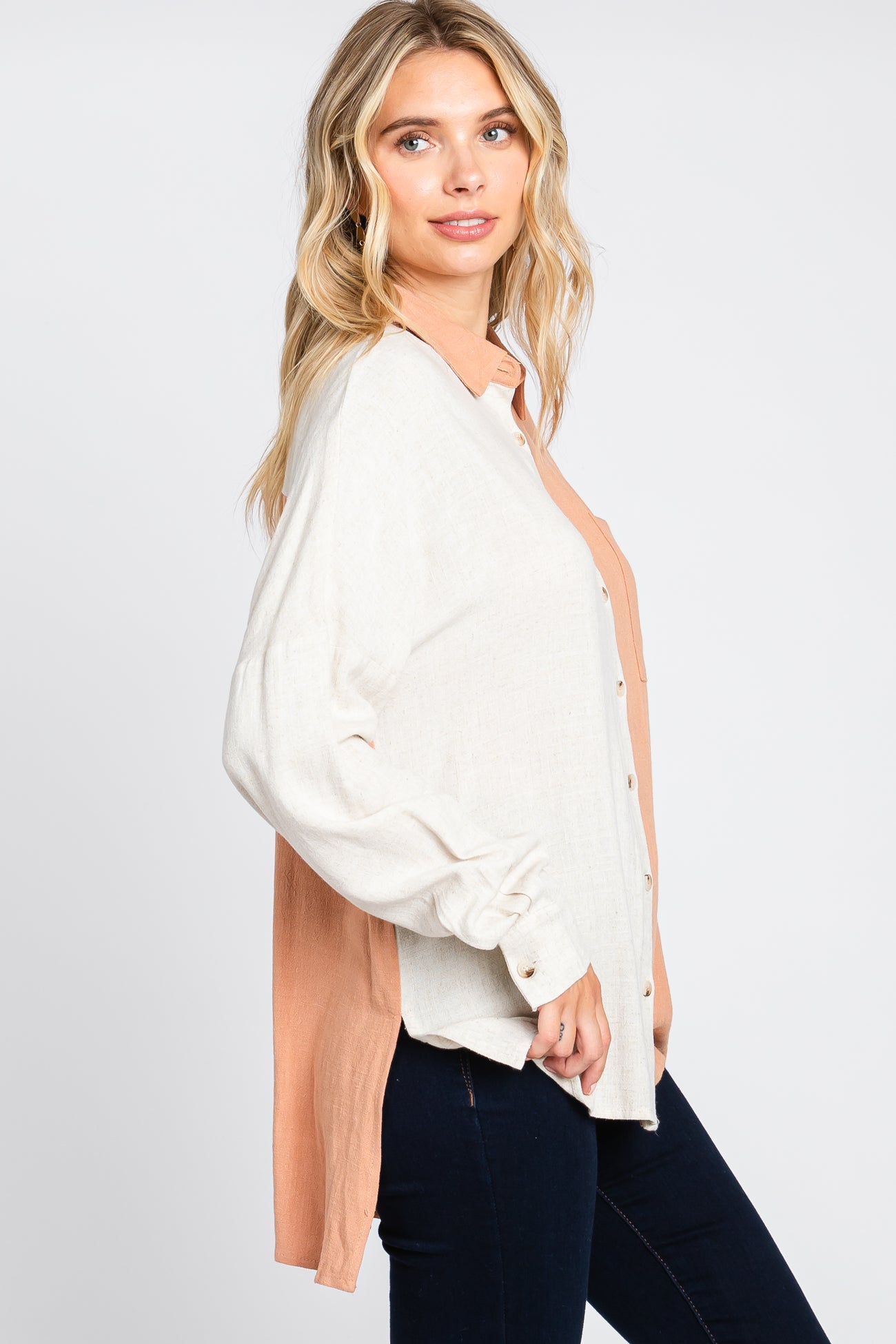 A linen button up featuring a color block design, a collar, front functioning buttons, a front pocket, long drop shoulder sleeves, side slits at the hem, and a hi-lo hem.