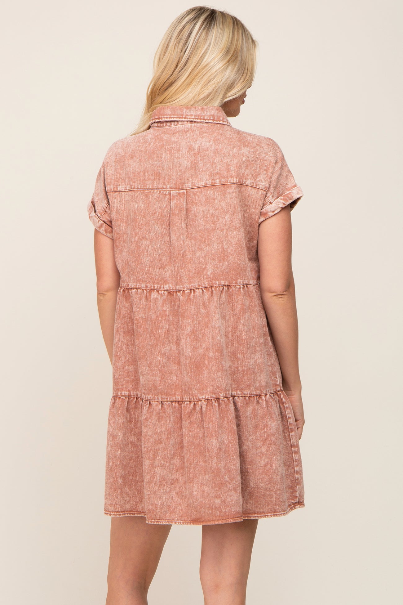 A faded denim dress with a collar, front pockets, cuffed short dolman sleeves, front functioning buttons, and a tiered body.