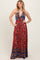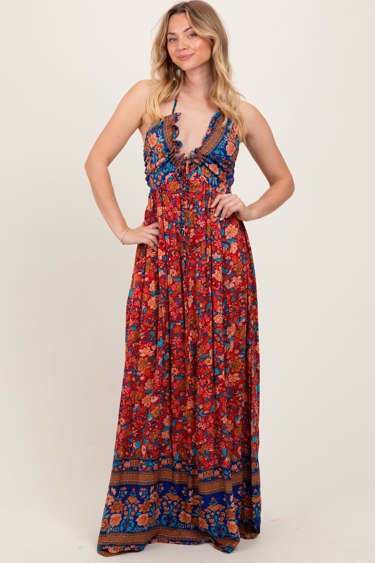 Rust Floral Colorblock Halter Tie Back Maxi Dress