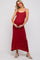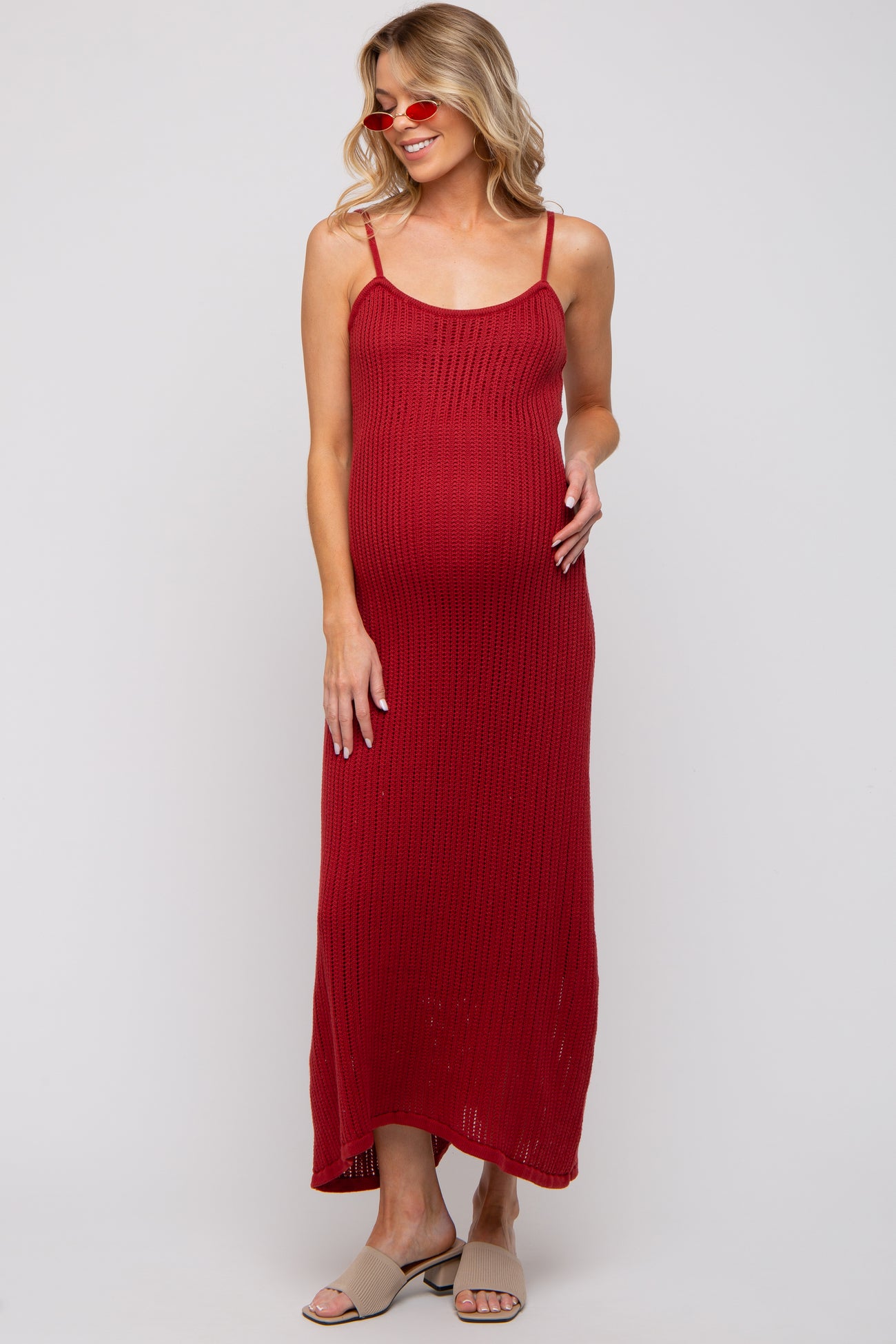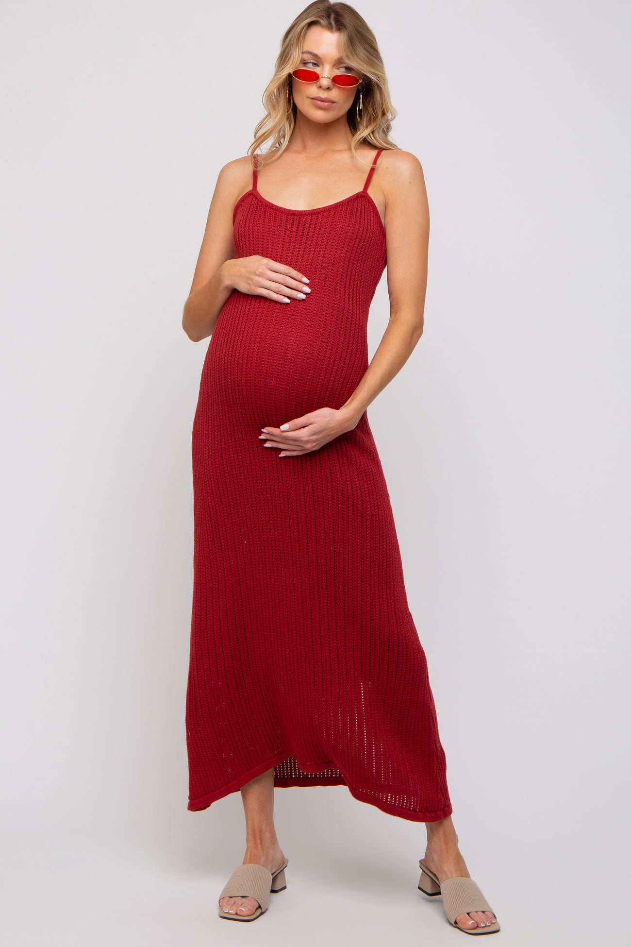 An open knit crochet maternity dress featuring adjustable straps and a scoop neckline. Dress is lined.