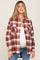 A plaid print maternity shirt jacket featuring long sleeves, a collared neckline, a button down front, front pockets and a curved hem.