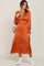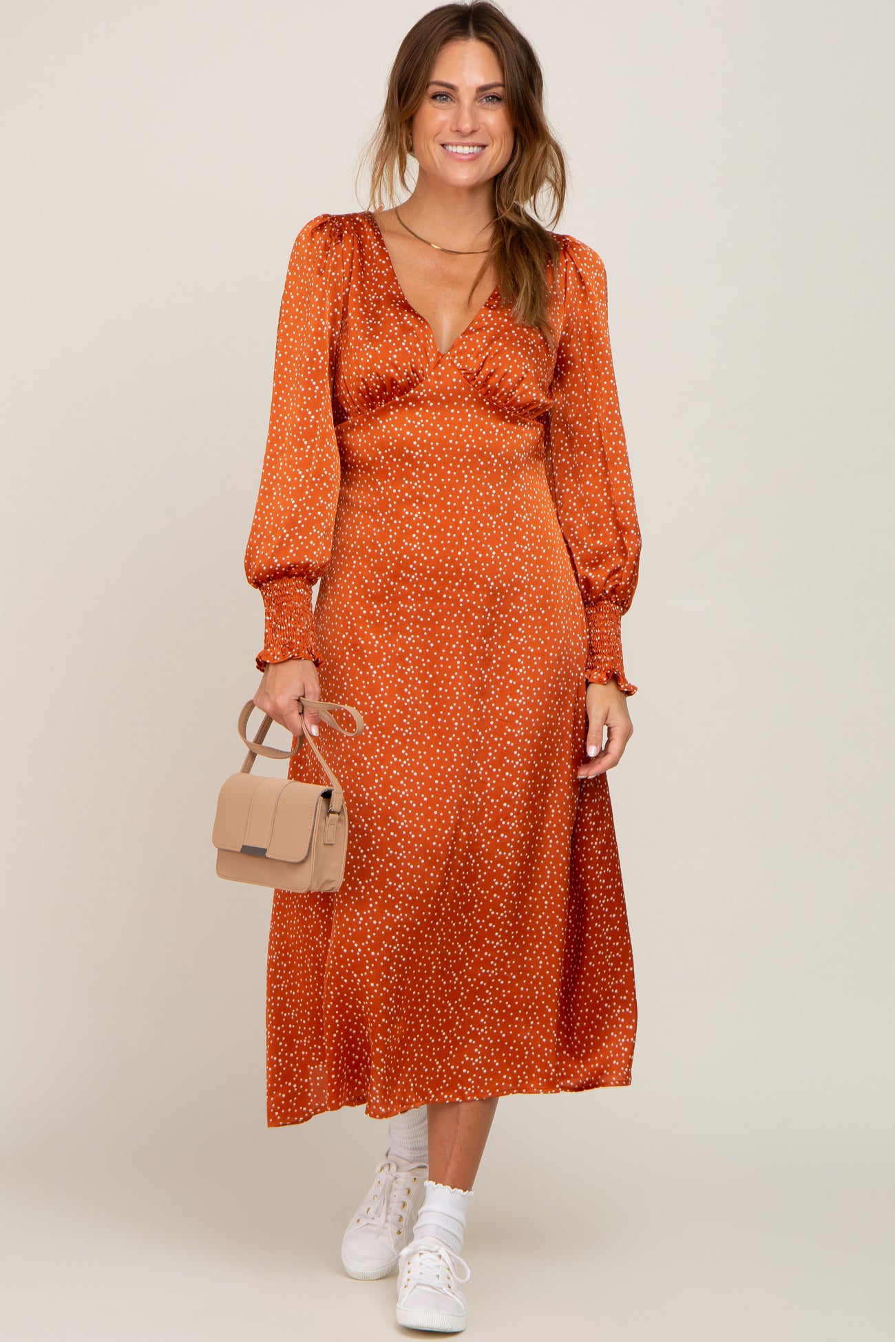 A polka dot print midi dress featuring a deep v-neckline, long sleeves with smocking, and a back zipper closure. Dress is lined.